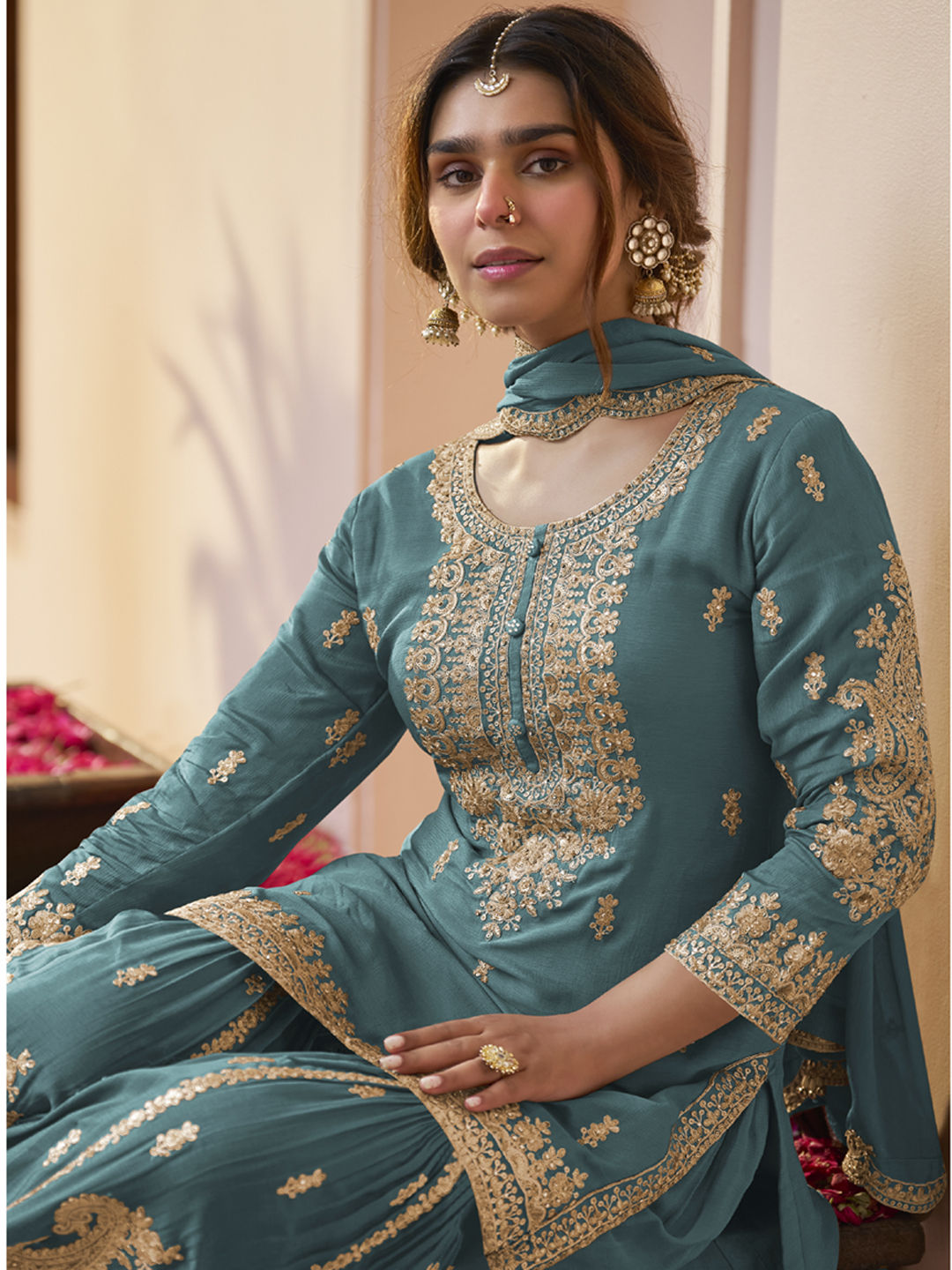 Blue color Salwar Kameez in Chinon Silk fabric with Embroidered, Sequence, Thread, Zari work