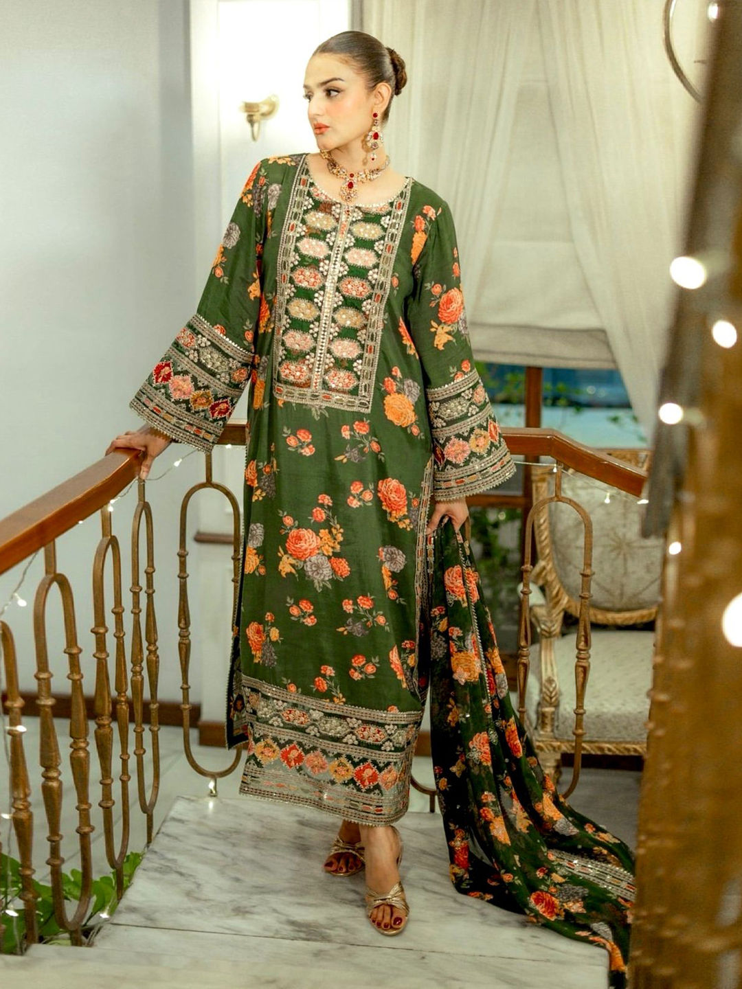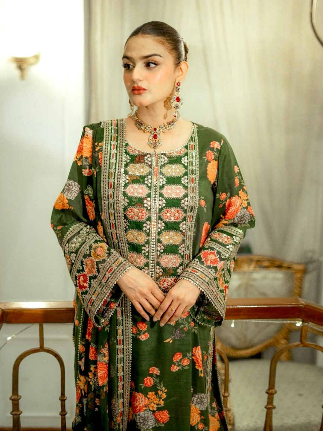 in Green with Digital Print work