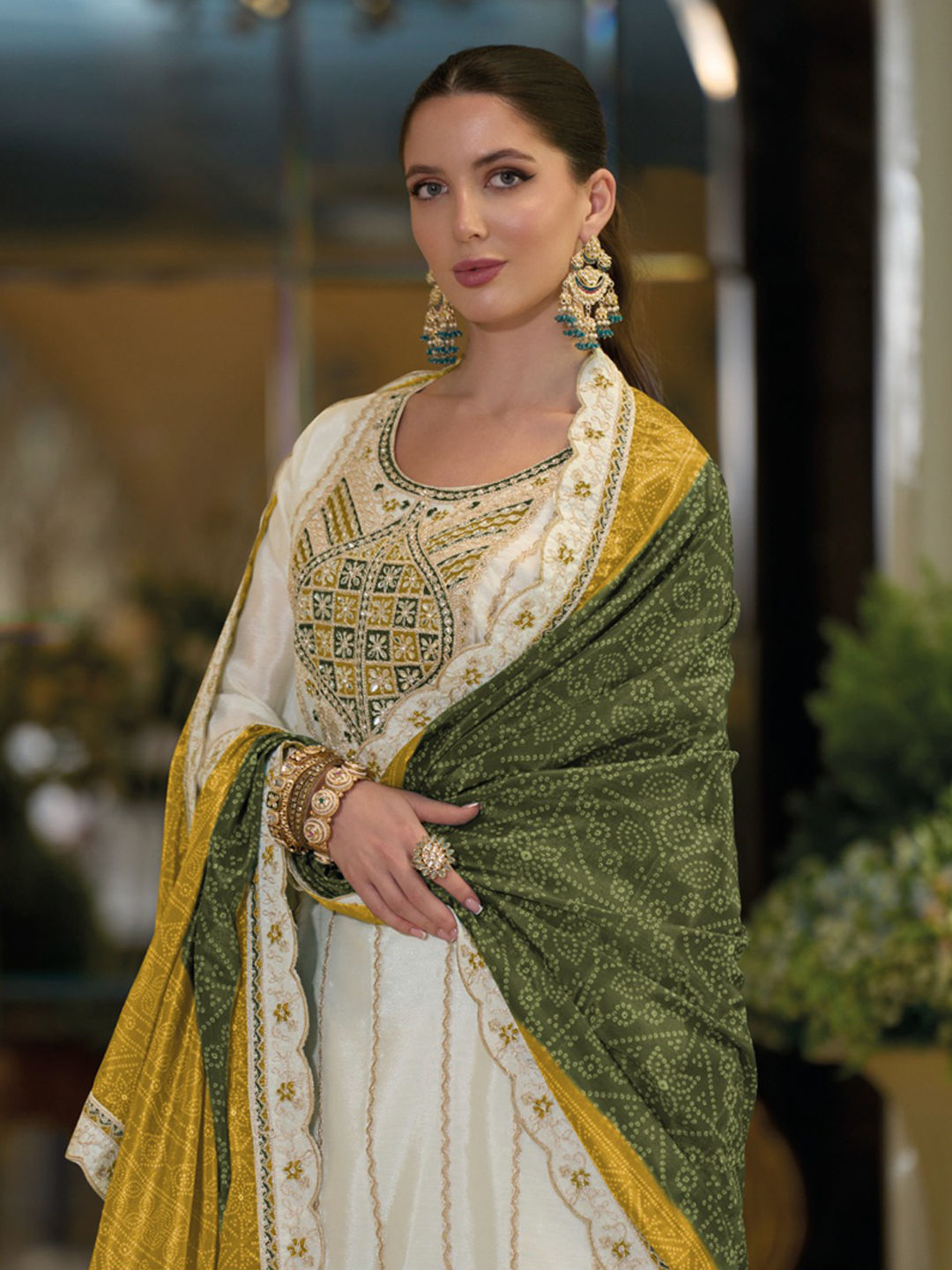 Green, White and Off White color Salwar Kameez in Chinon Silk fabric with Embroidered, Sequence, Thread work