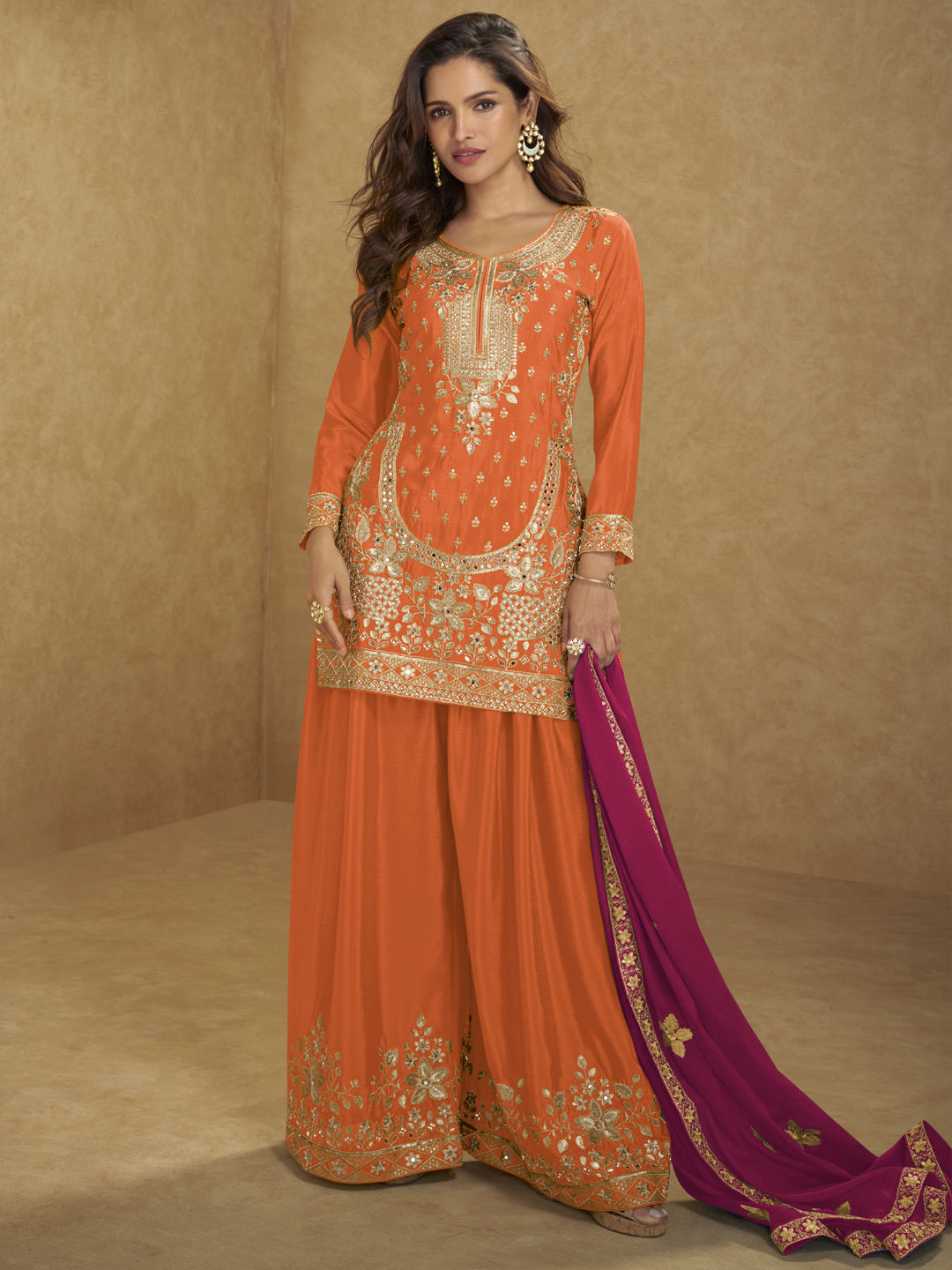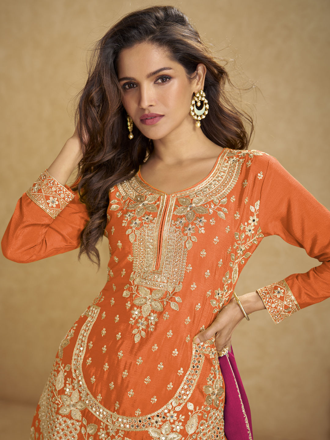 Orange color Salwar Kameez in Chinon Silk fabric with Embroidered, Mirror, Sequence, Zari work