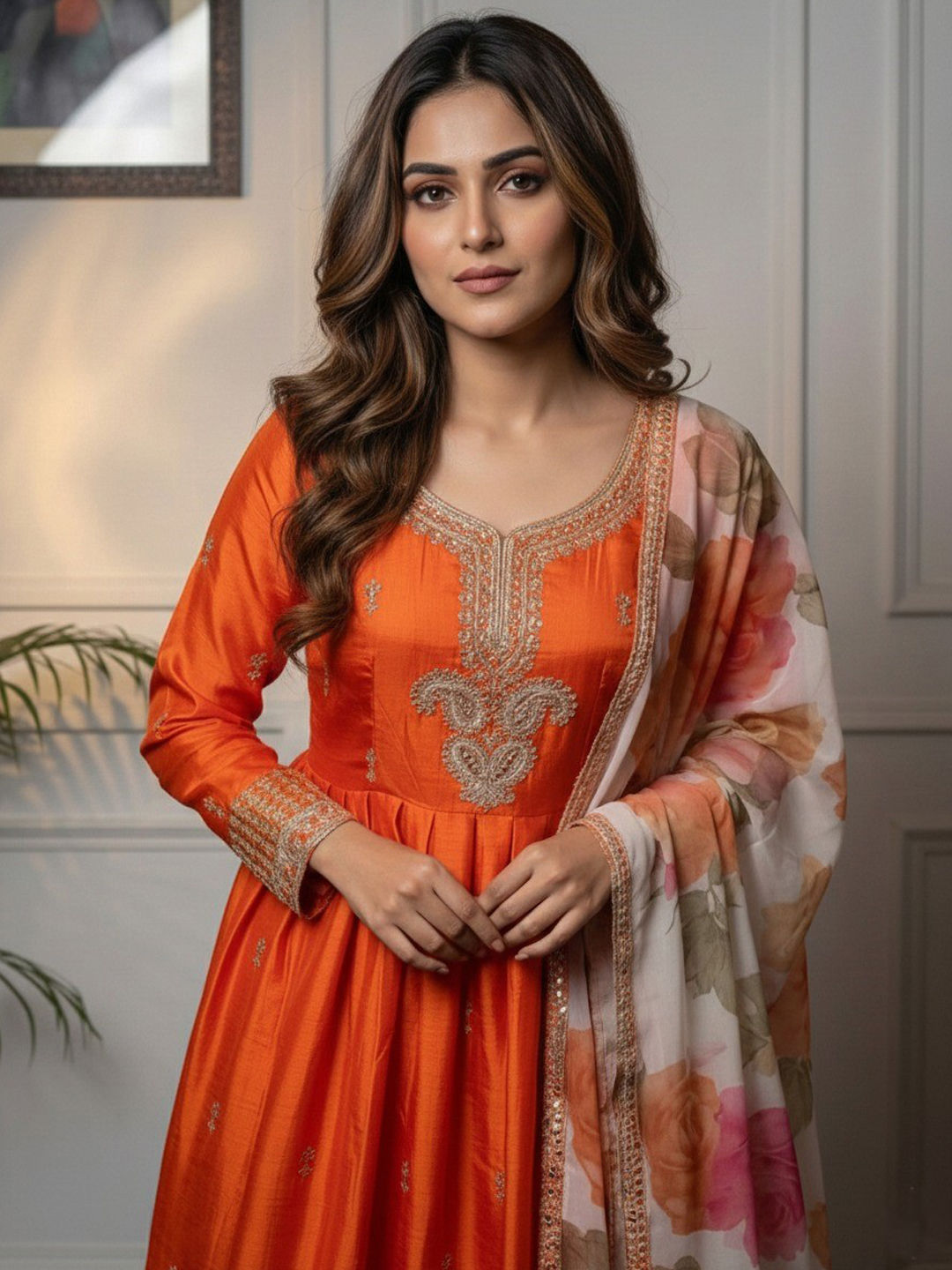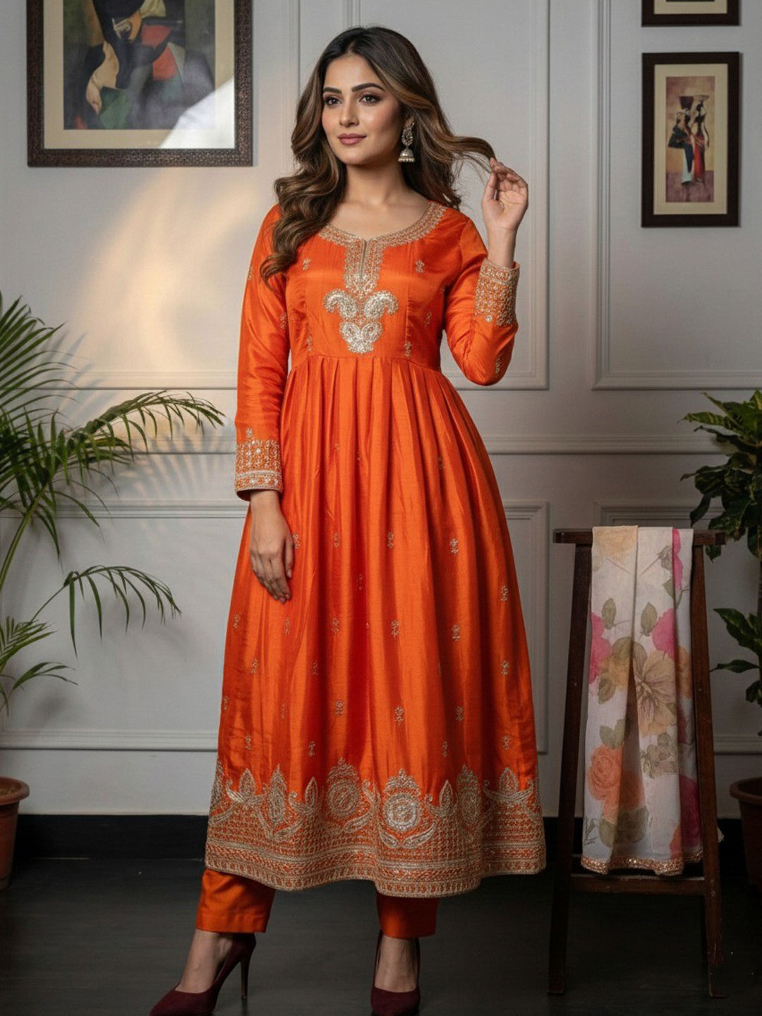 Orange color Salwar Kameez in Chinon Silk fabric with Embroidered, Sequence, Thread, Zari work