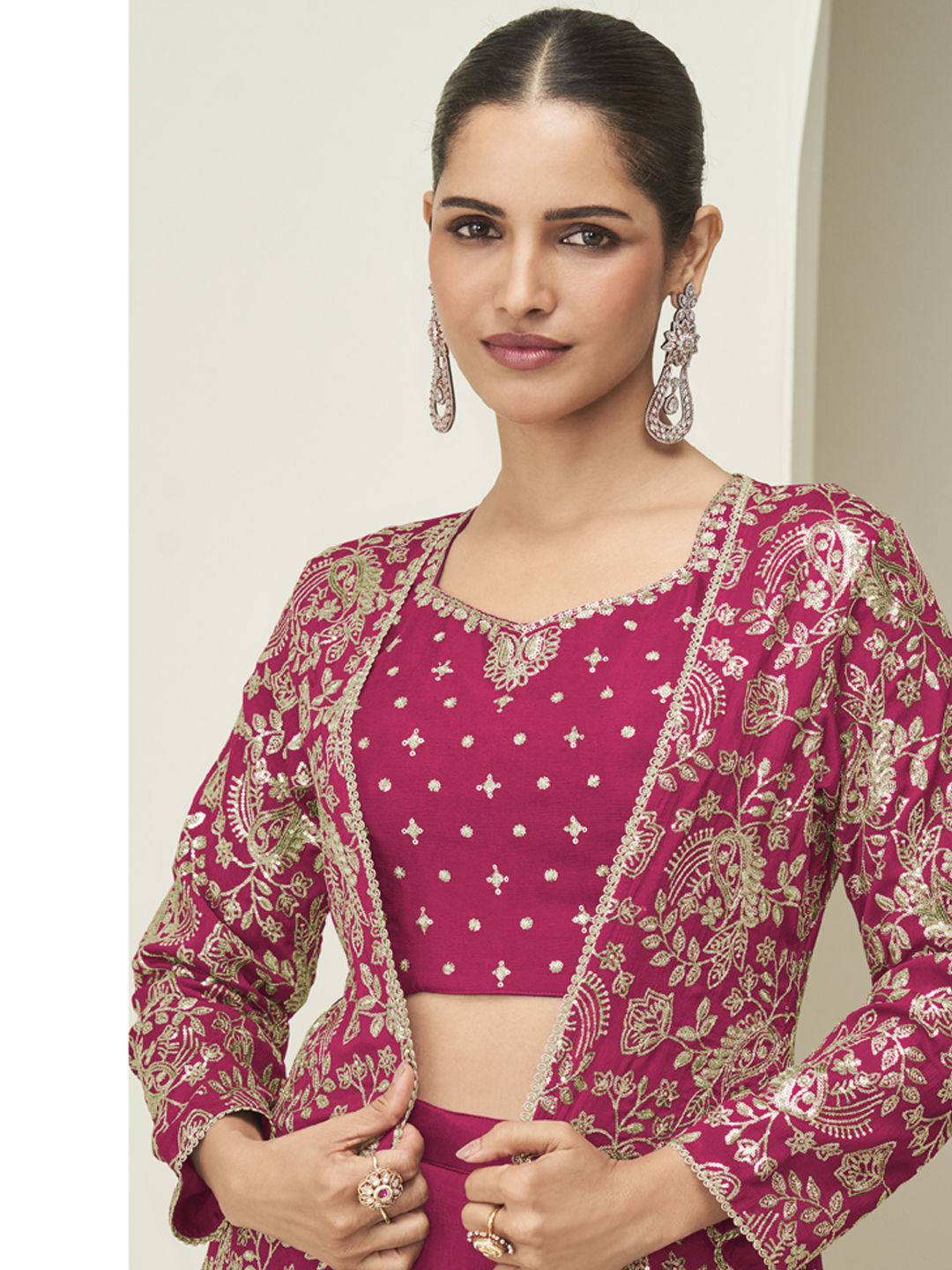 Red and Maroon color Salwar Kameez in Chinon Silk fabric with Sequence work