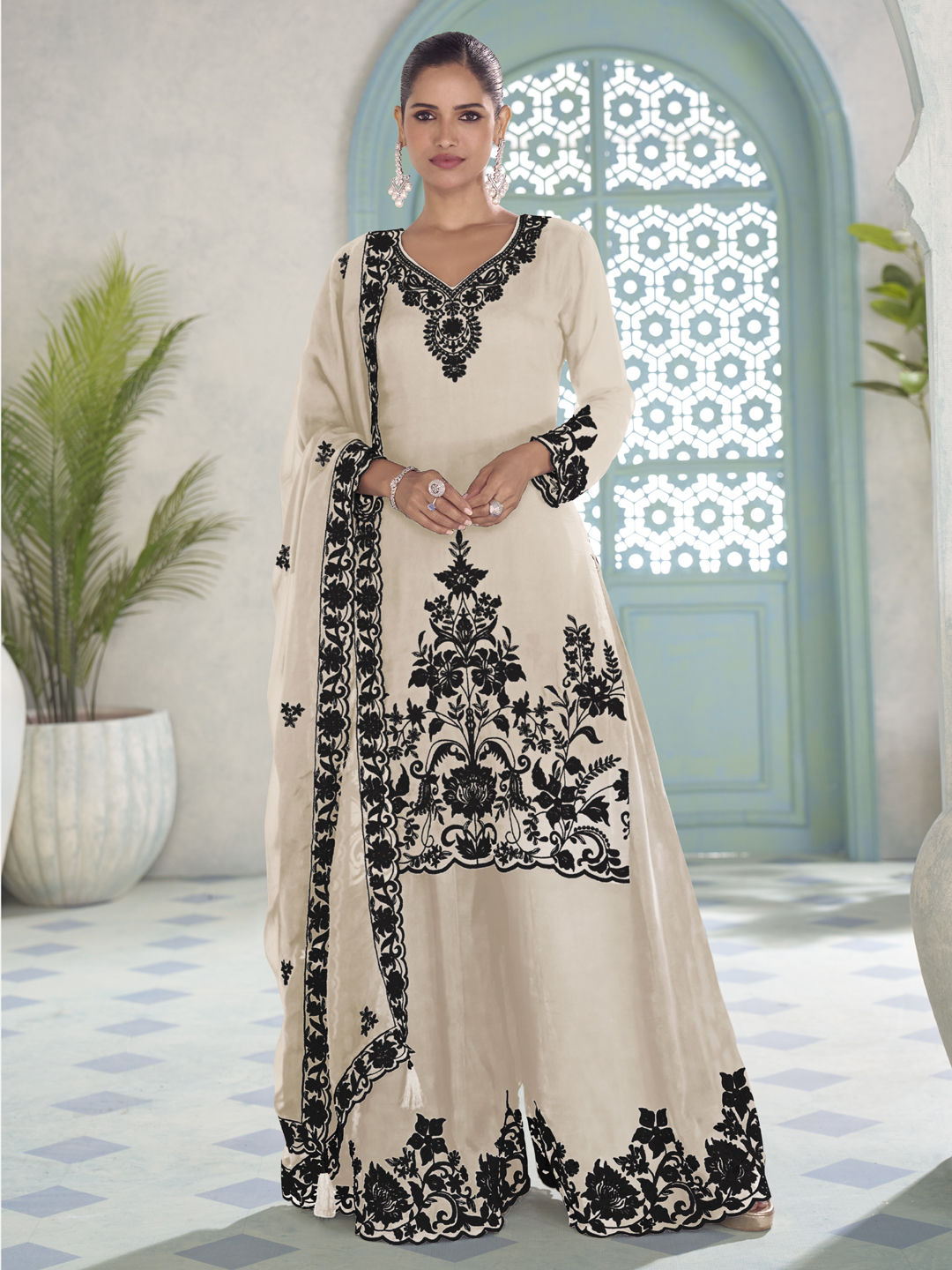 in White and Off White with Embroidered work