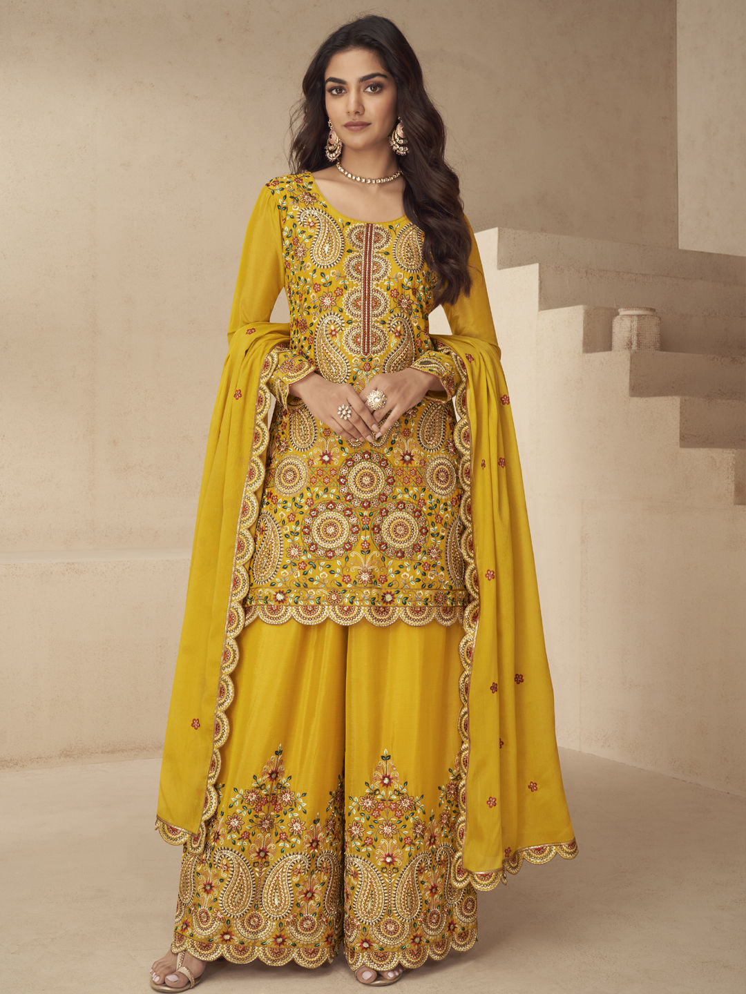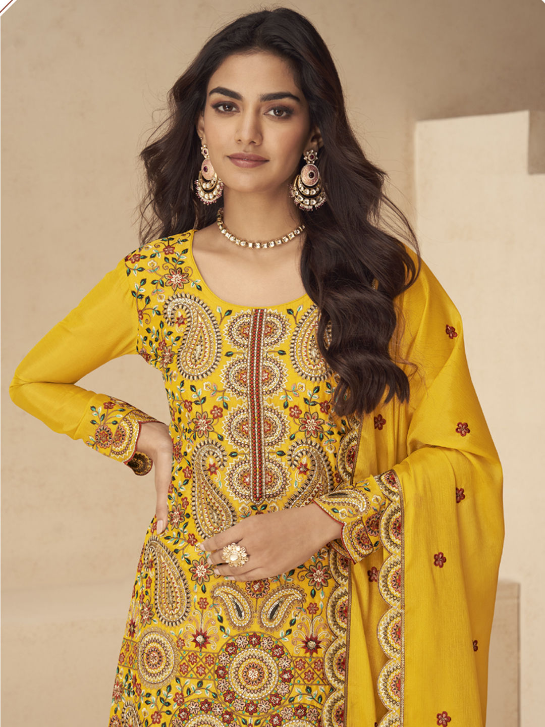 Yellow color Salwar Kameez in Chinon Silk fabric with Embroidered, Sequence, Thread work