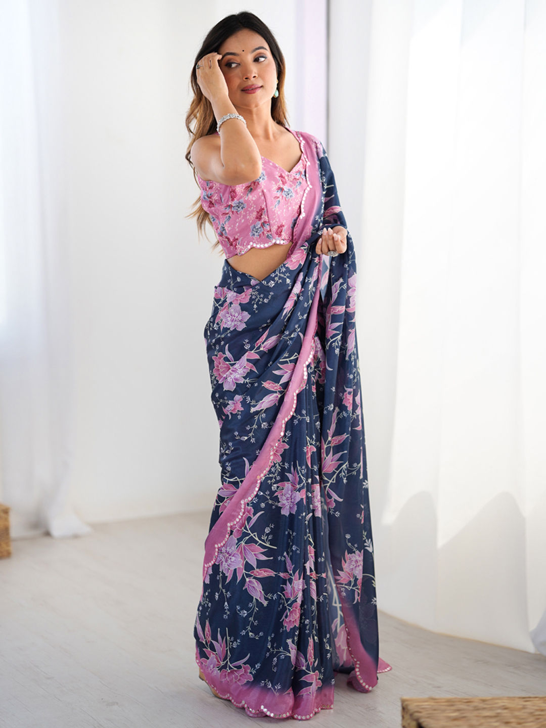 Chinon Silk Festive Saree in Pink and Majenta with Floral work