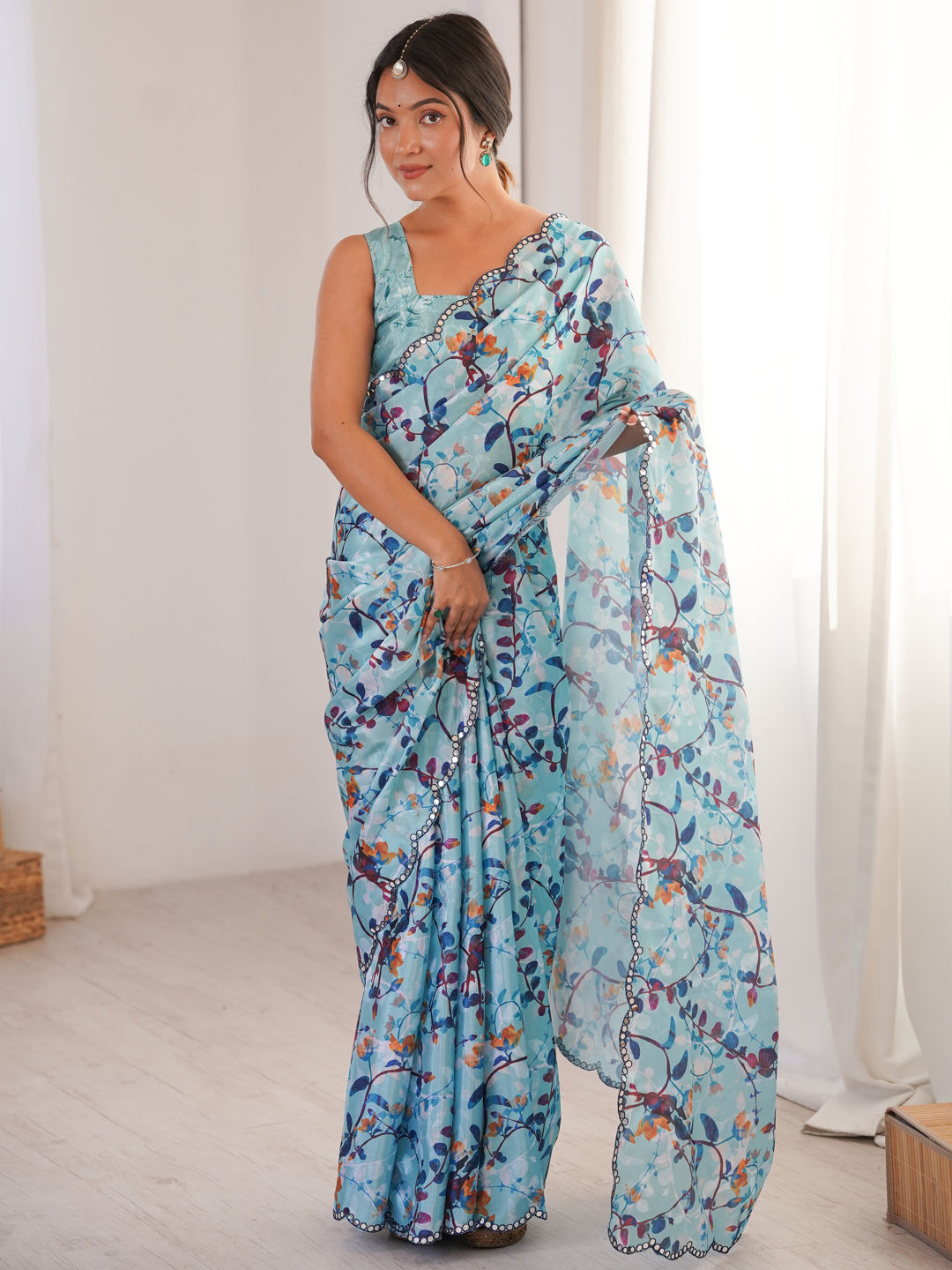Blue color Saree in Chinon Silk fabric with Digital Print, Mirror work