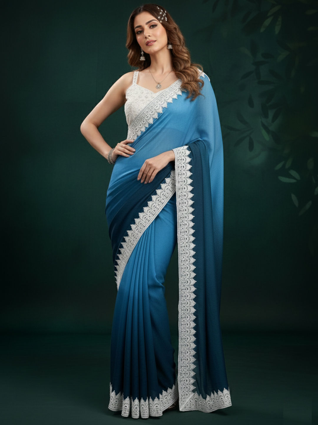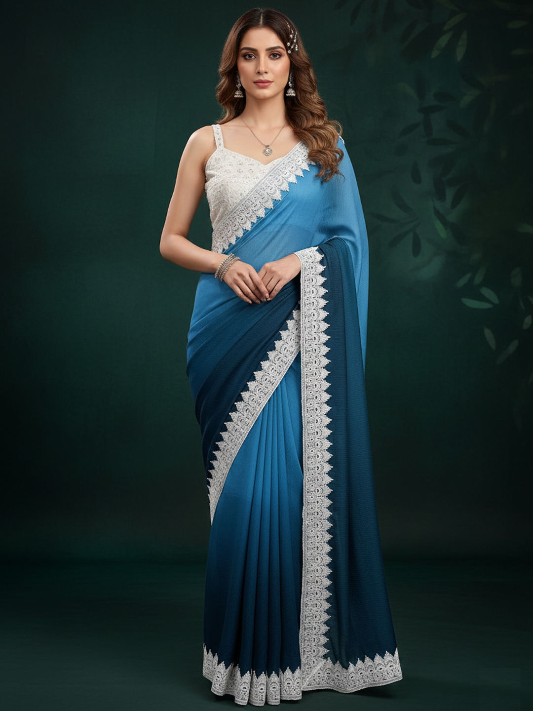 Blue color Saree in Chinon Silk fabric with Embroidered, Resham, Thread work