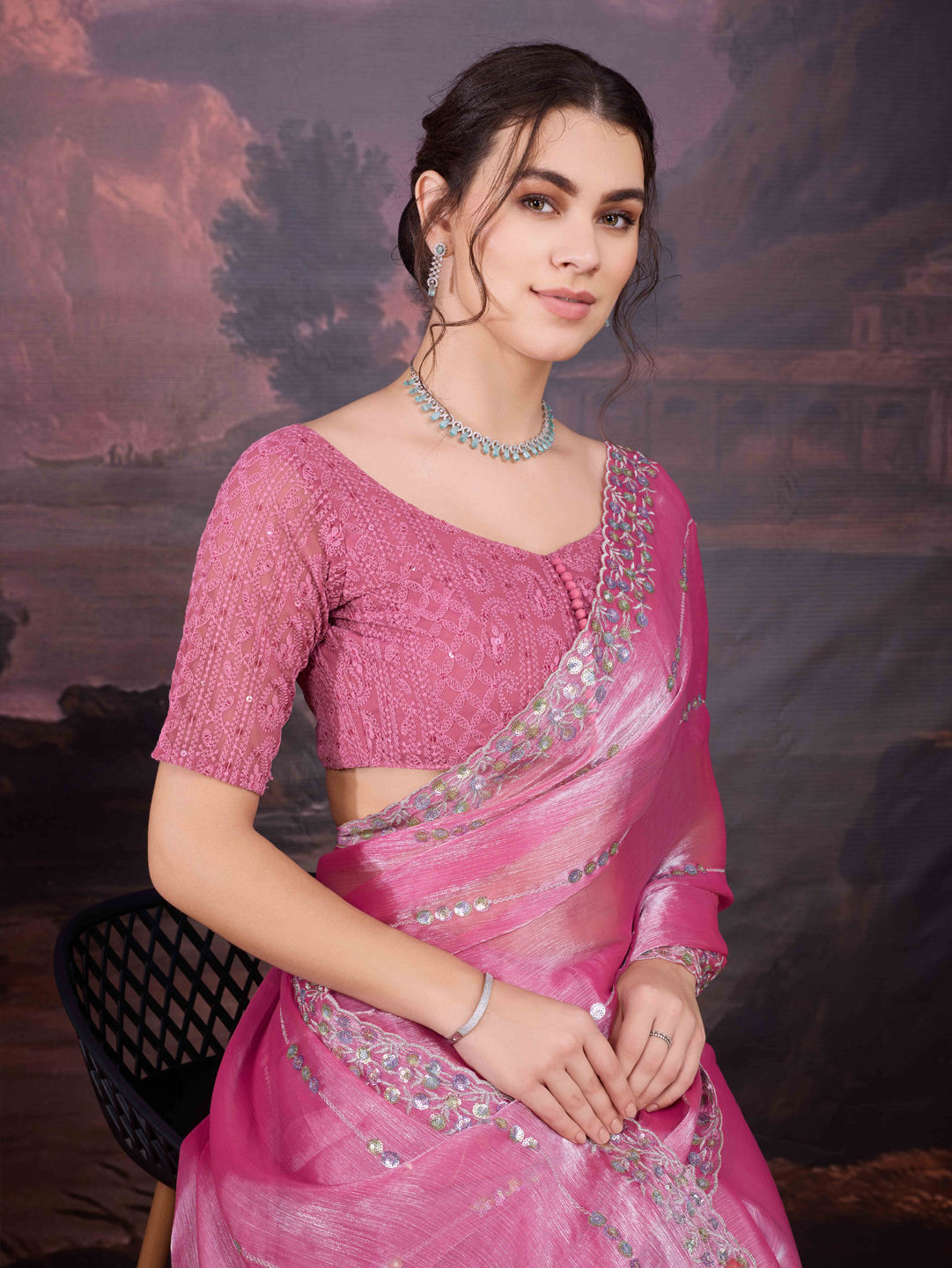 Pink and Majenta color Saree in Chinon Silk fabric with Embroidered, Sequence work