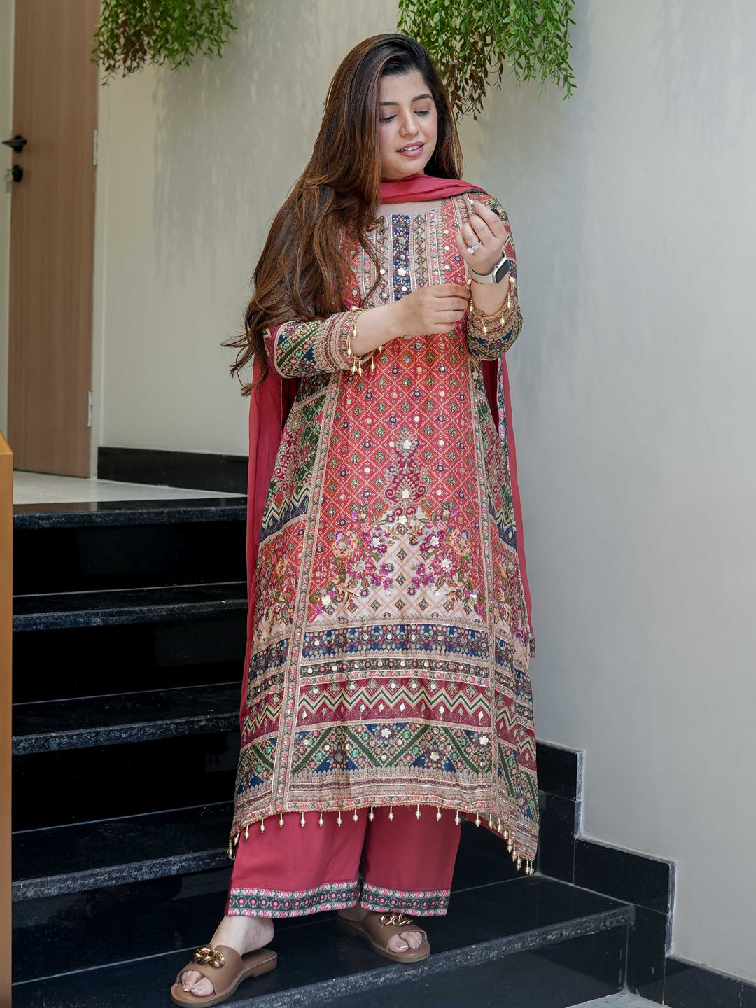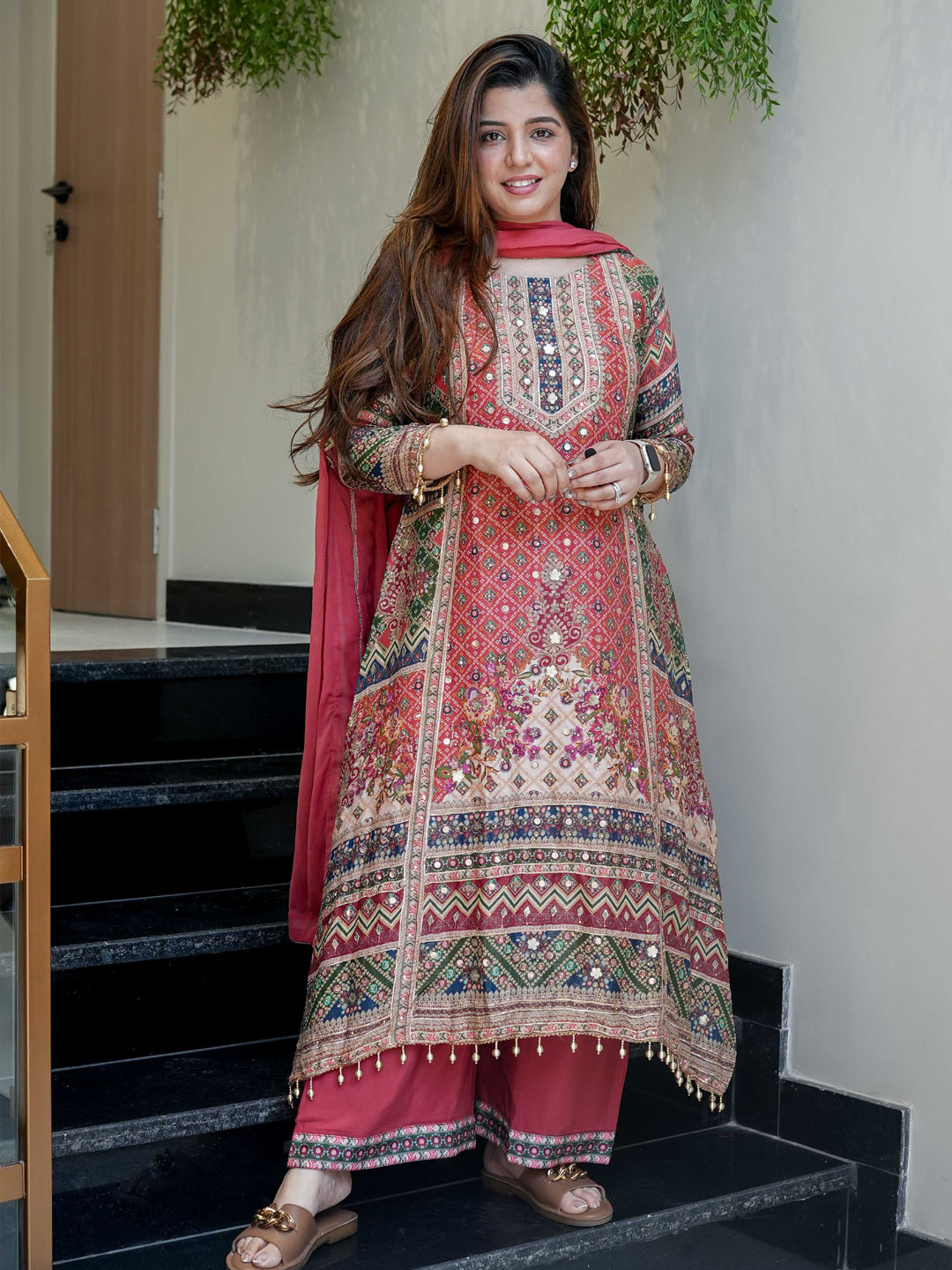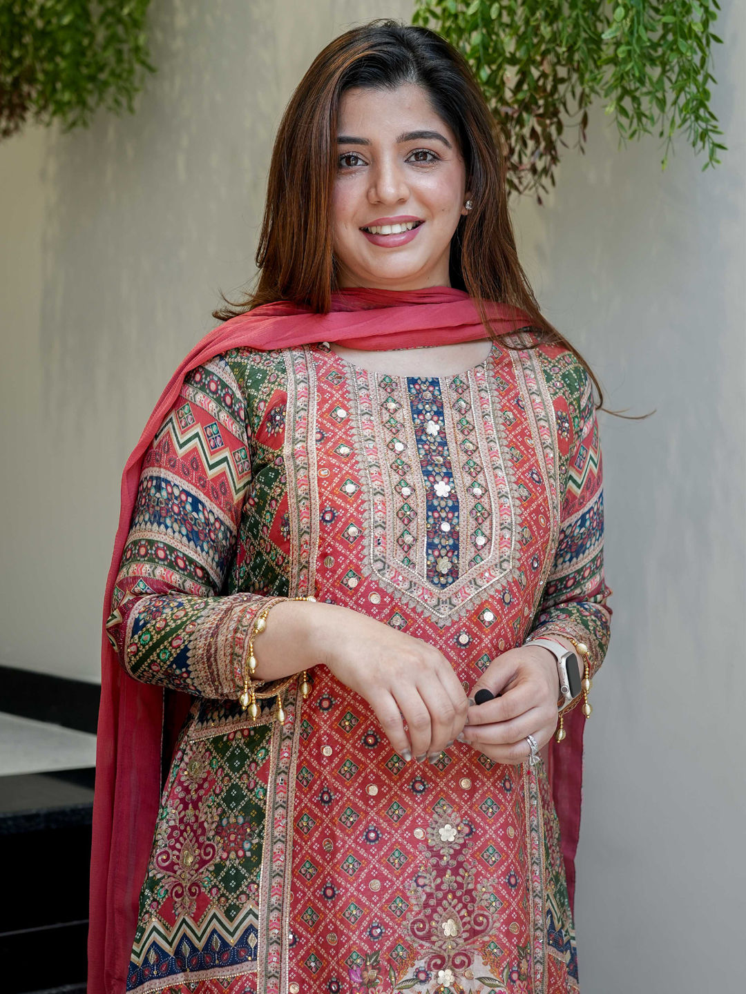 Pink and Majenta color Salwar Kameez in Chinon Silk fabric with Bandhej, Embroidered, Floral work