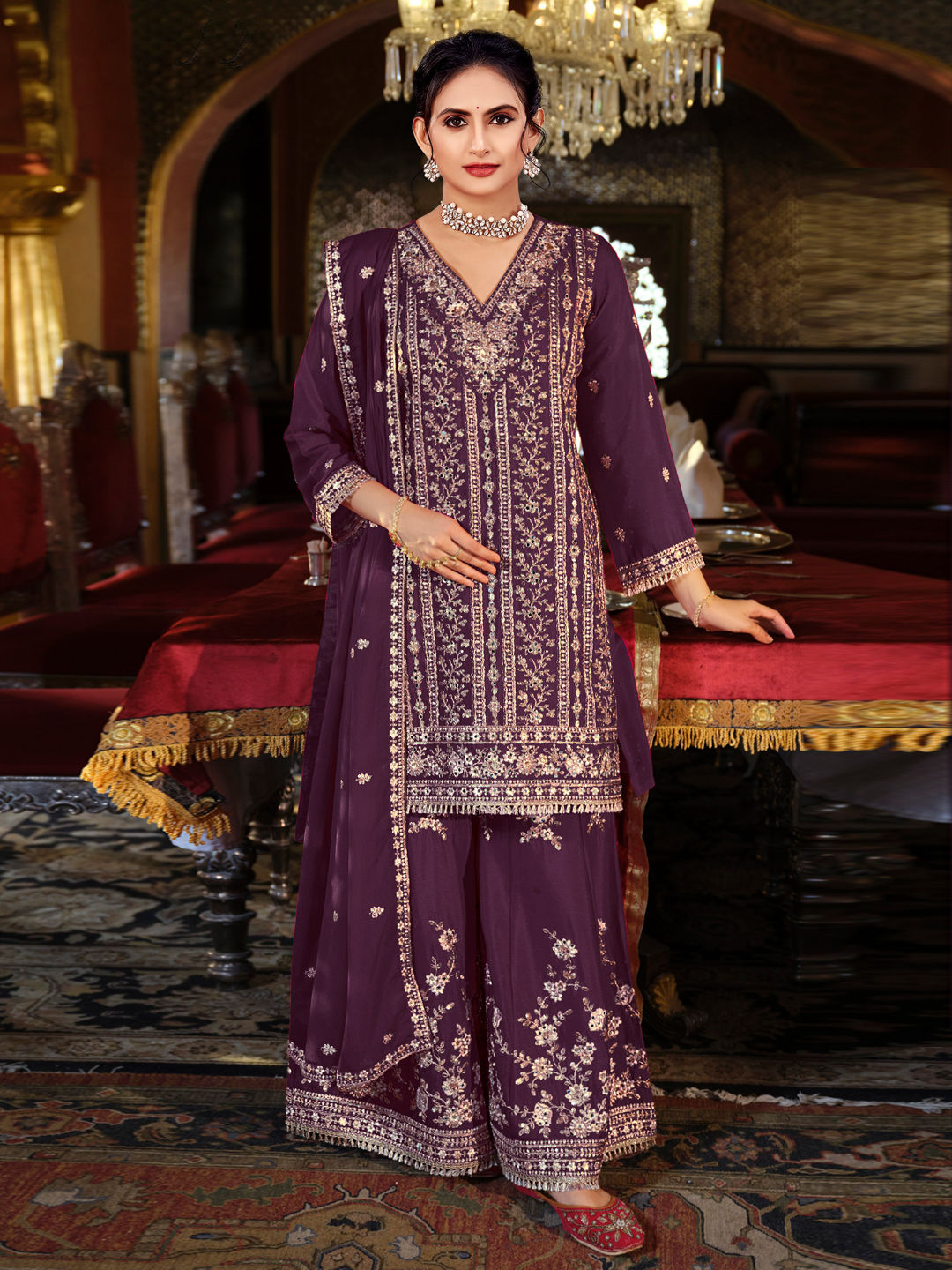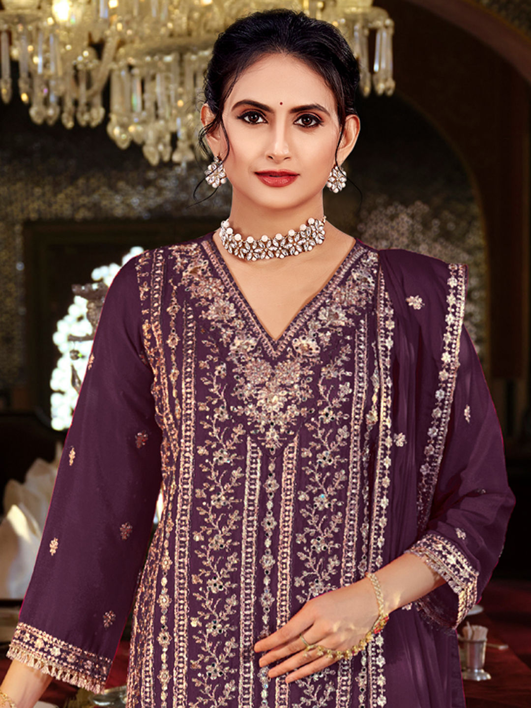 Purple and Violet color Salwar Kameez in Chinon Silk fabric with Embroidered, Mirror, Sequence work