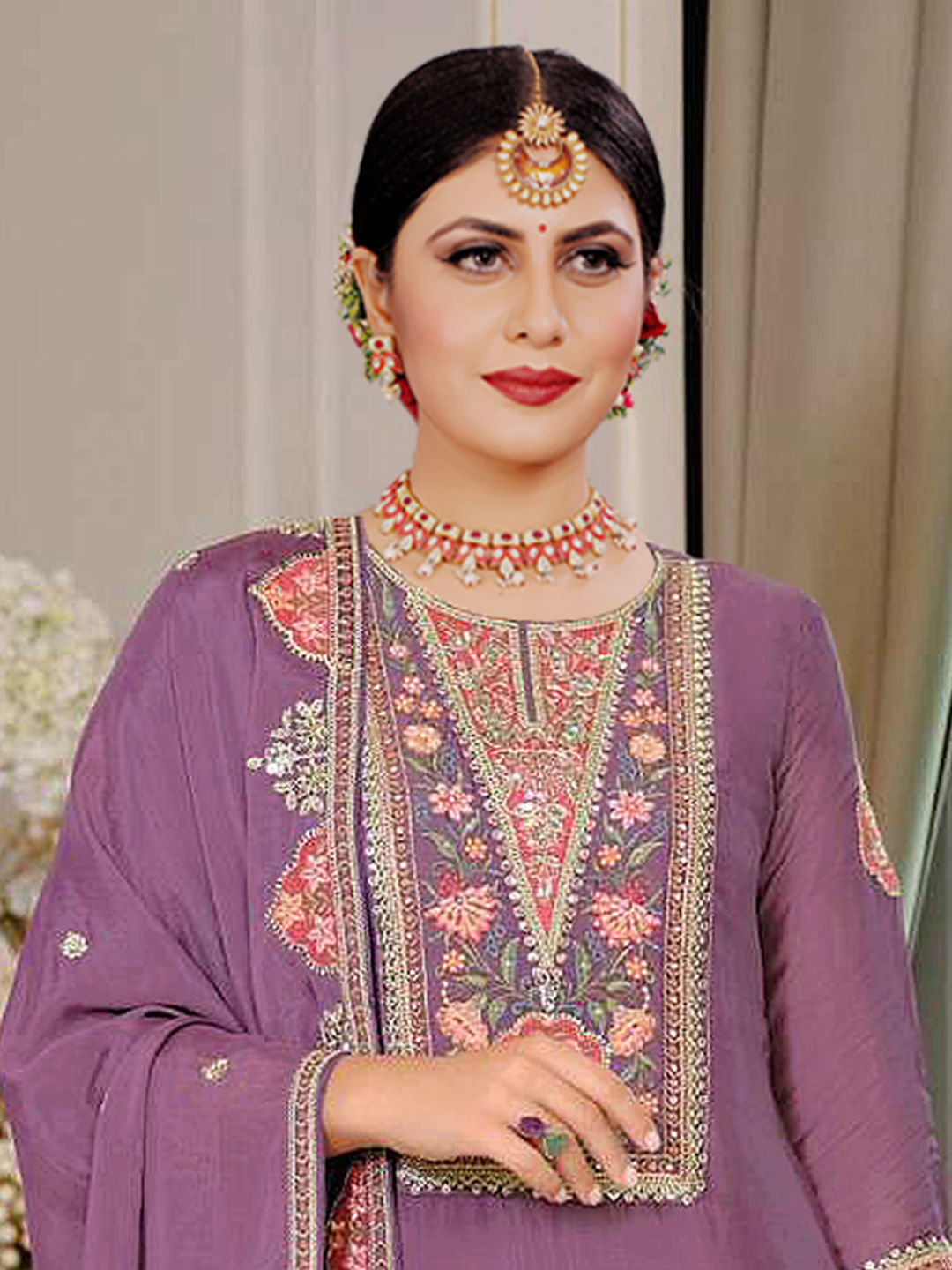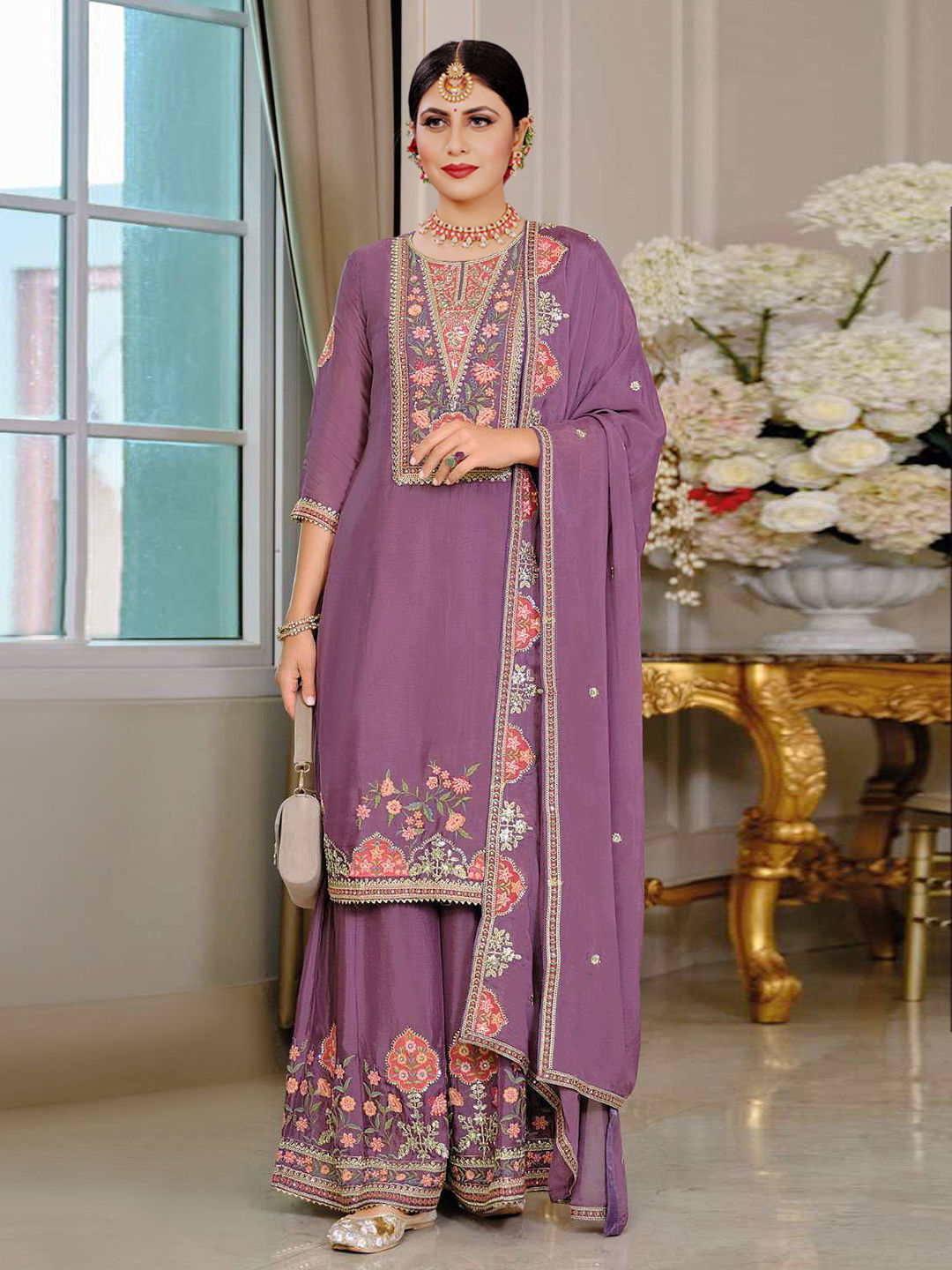 Purple and Violet color Salwar Kameez in Chinon Silk fabric with Embroidered, Sequence work
