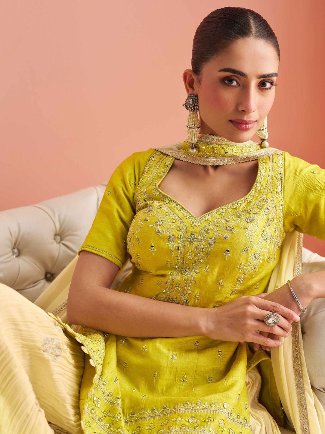 Yellow color Salwar Kameez in Chinon Silk fabric with Embroidered, Mirror, Printed work