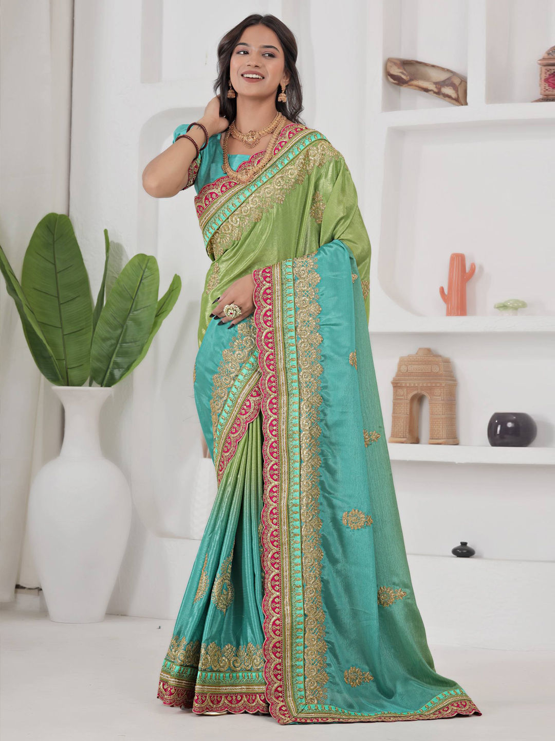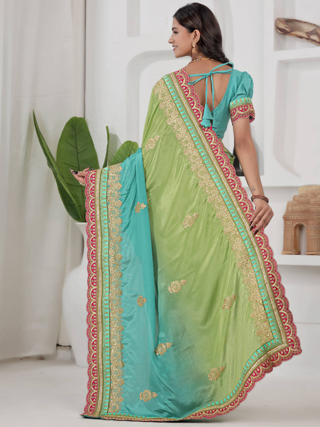 Blue, Green color Saree in Chinon Silk fabric with Border, Embroidered, Sequence work