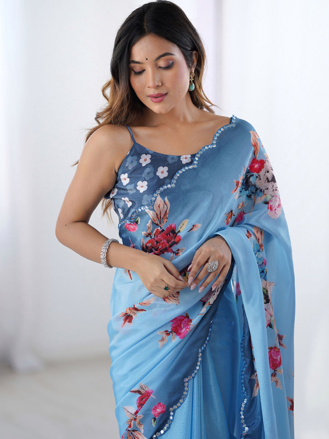 Blue color Saree in Chinon Silk fabric with Border, Floral, Mirror, Printed work