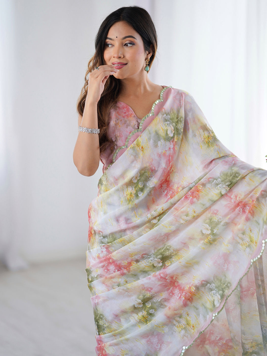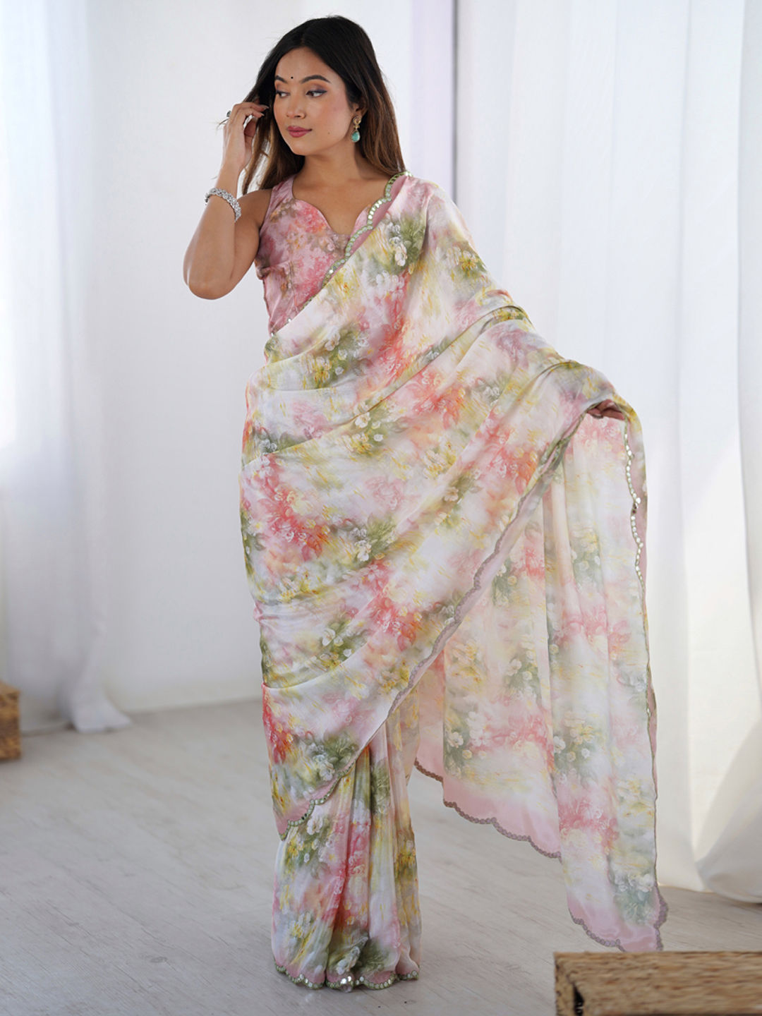 White and Off White color Saree in Chinon Silk fabric with Border, Floral, Mirror, Printed work