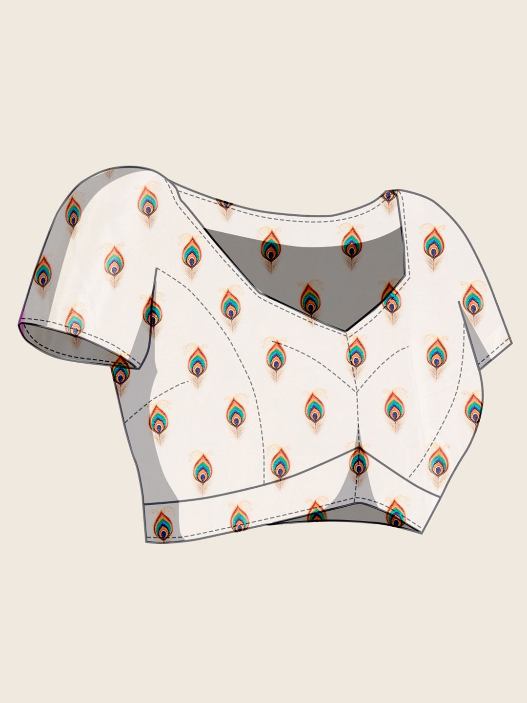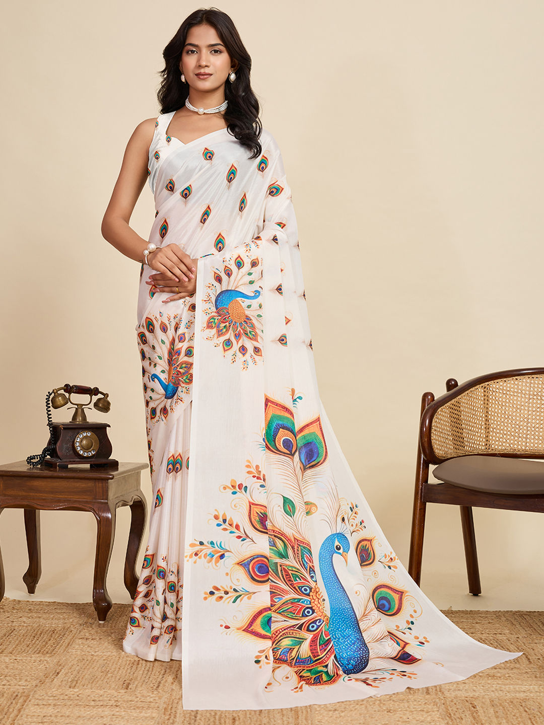 White and Off White color Saree in Chinon Silk fabric with Floral, Printed work