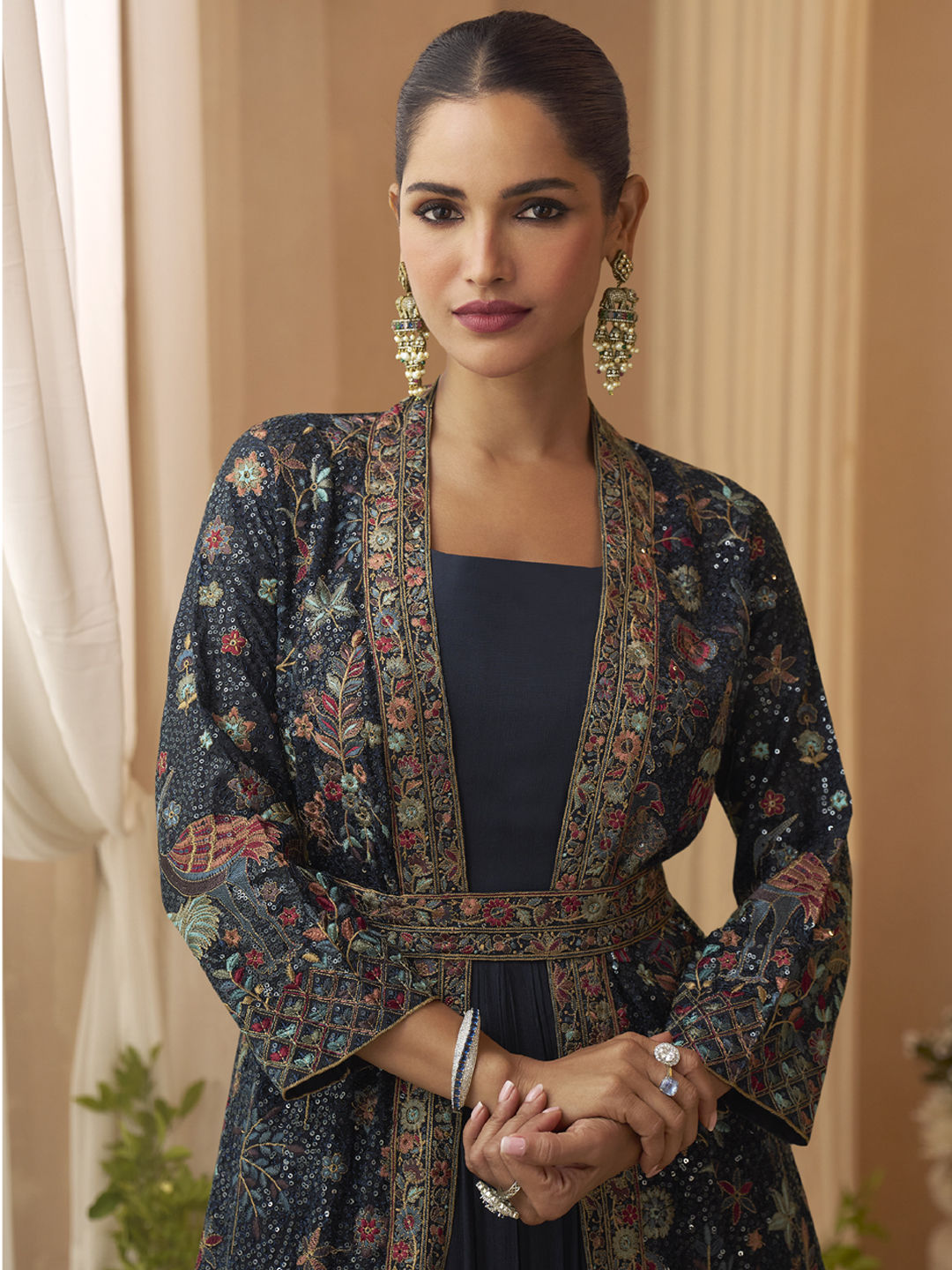 Chinon Silk Wedding Gown in Black and Grey with Embroidered work