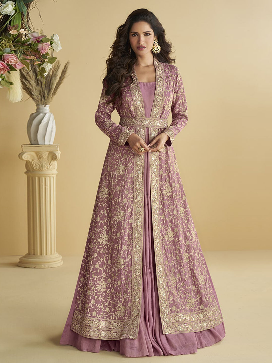 Pink and Majenta color Gown in Chinon Silk fabric with Embroidered, Sequence, Zari work