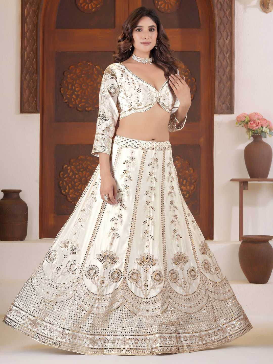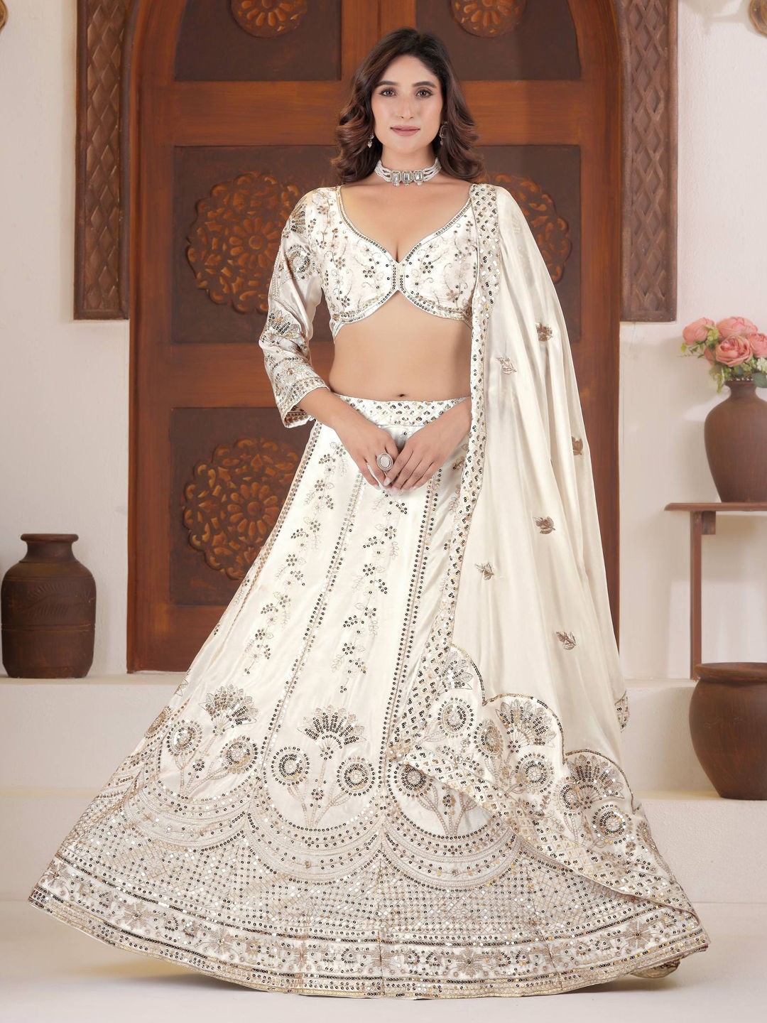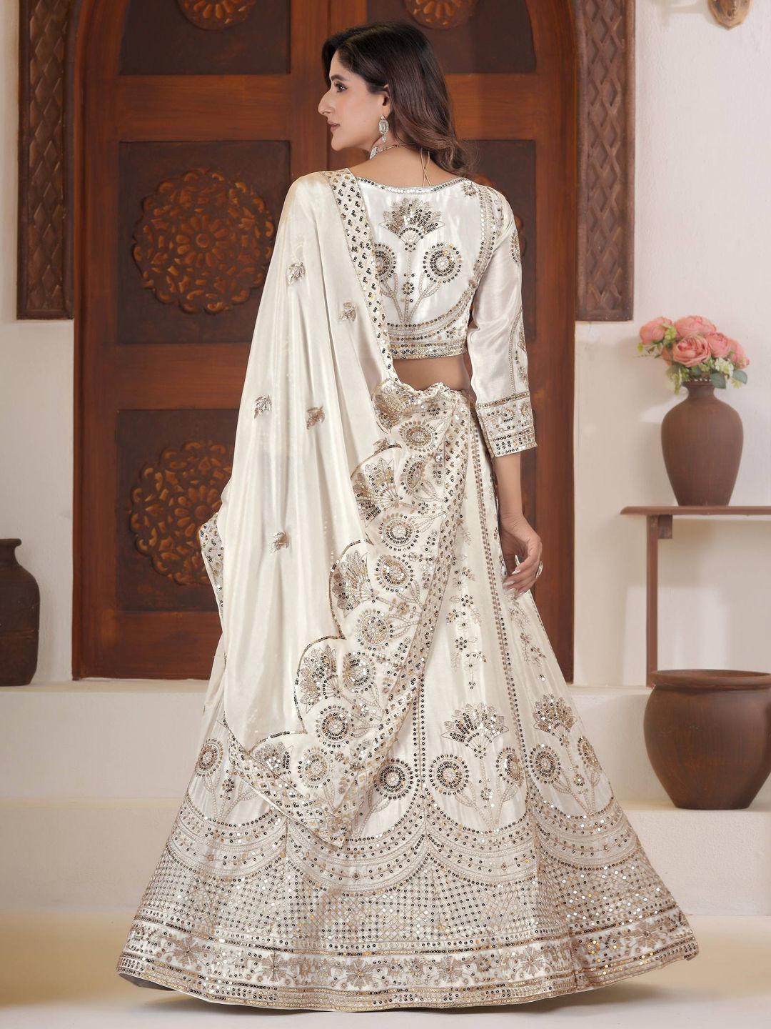 White and Off White color Lehenga in Chinon Silk fabric with Embroidered, Sequence work