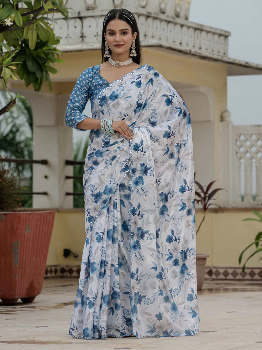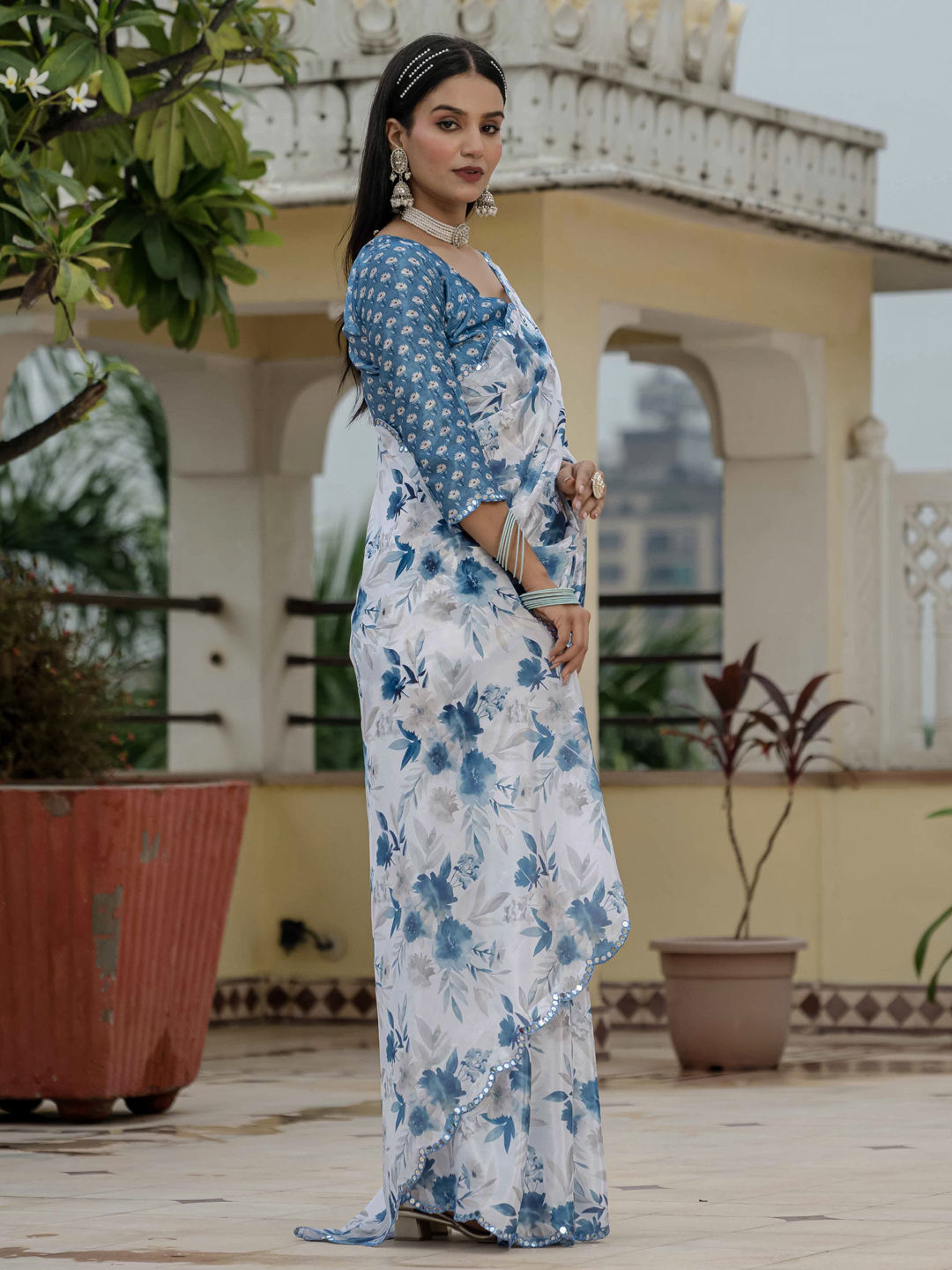 White and Off White color Readymade Saree in Chinon Silk fabric with Digital Print, Embroidered, Floral work