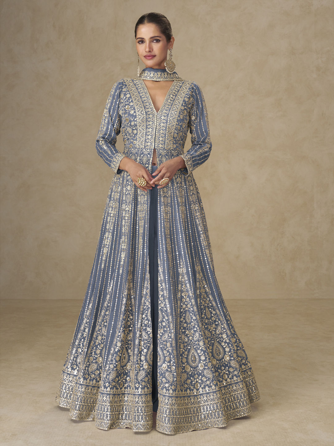 Chinon Silk Festive Salwar Kameez in Blue with Embroidered work
