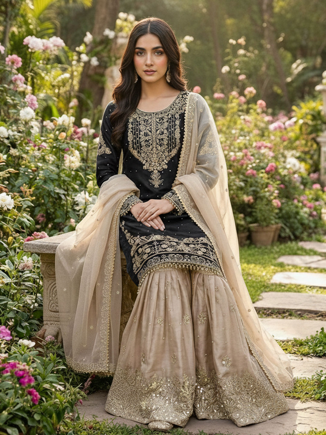 Black and Grey color Salwar Kameez in Chinon Silk fabric with Embroidered, Sequence, Thread, Zari work