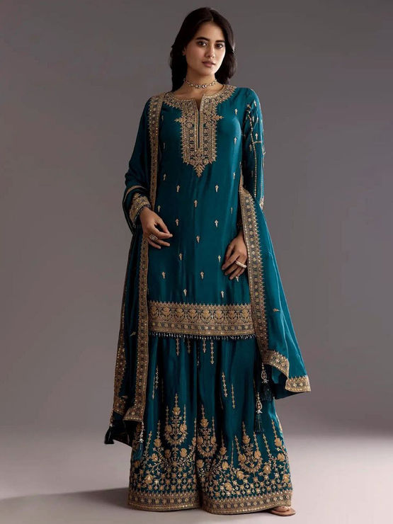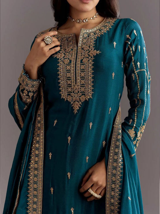 Blue color Salwar Kameez in Chinon Silk fabric with Embroidered, Mirror, Sequence work