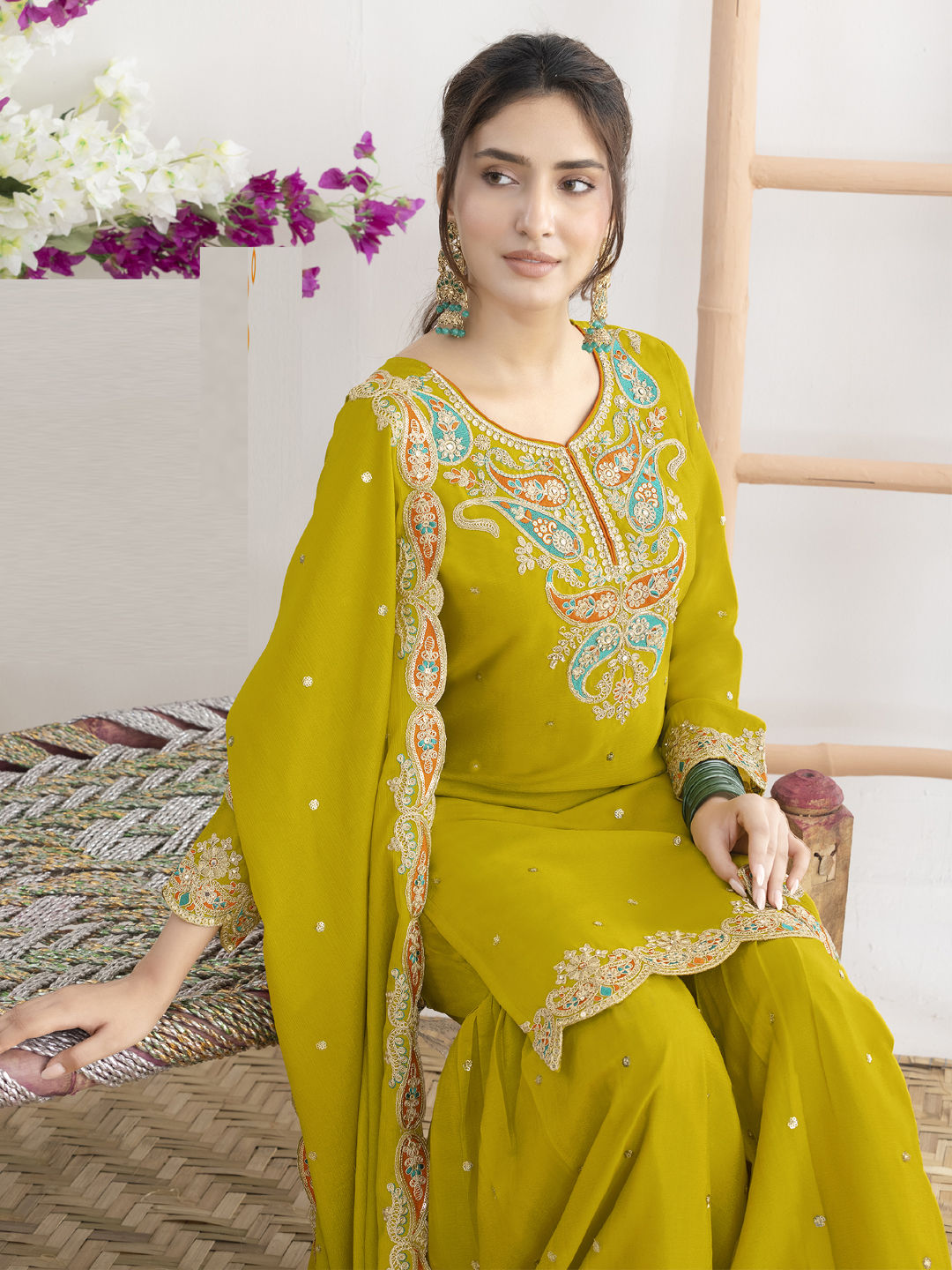 Green color Salwar Kameez in Chinon Silk fabric with Embroidered, Sequence, Thread, Zari work