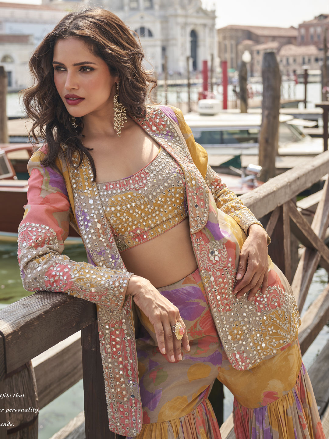 Multicolor color Salwar Kameez in Chinon Silk fabric with Embroidered, Mirror, Printed work