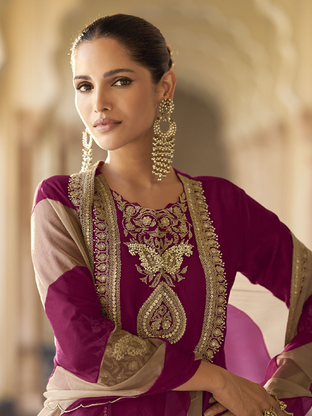 Pink and Majenta color Salwar Kameez in Chinon Silk fabric with Embroidered, Thread work