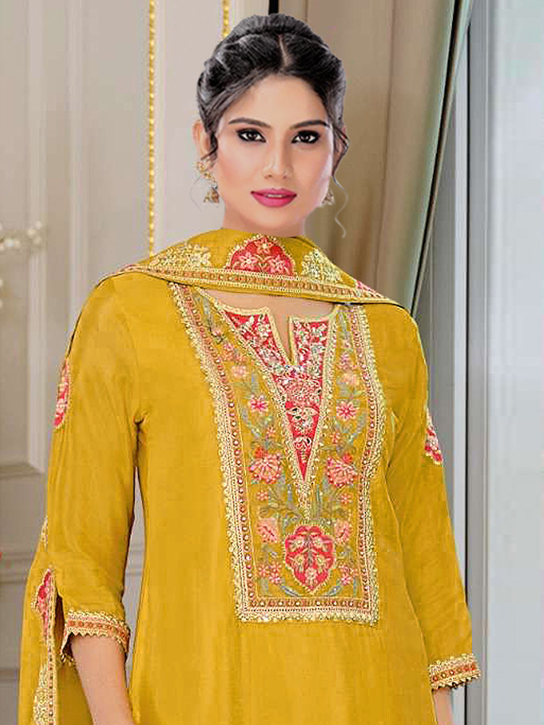 Yellow color Salwar Kameez in Chinon Silk fabric with Embroidered, Sequence work