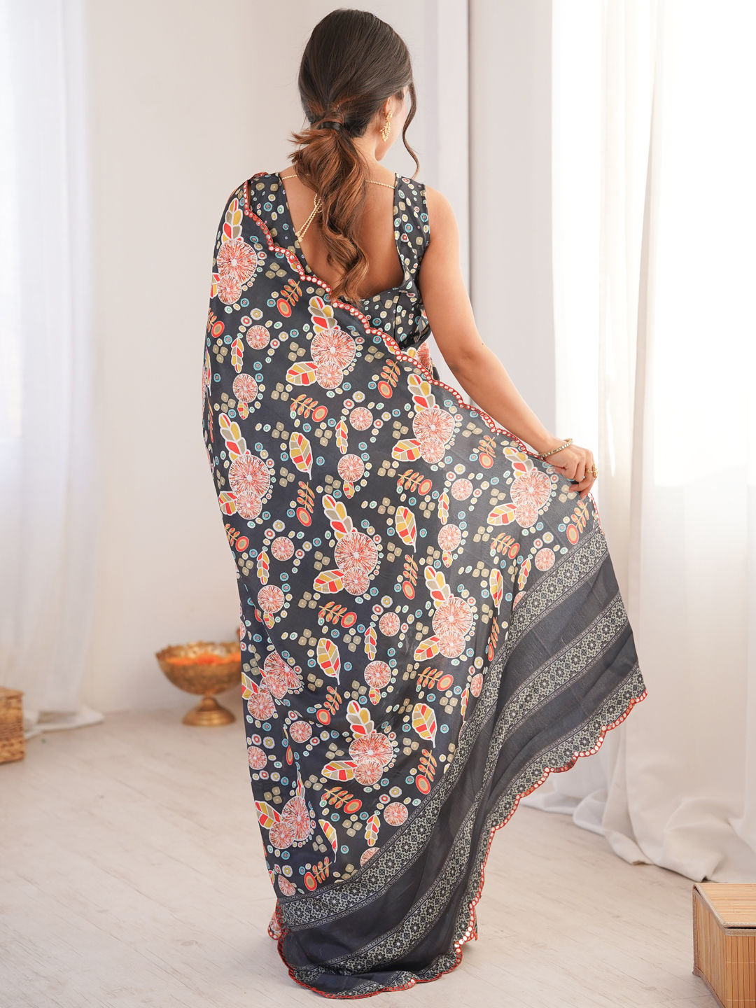 Black and Grey color Saree in Chinon Silk fabric with Digital Print, Mirror work