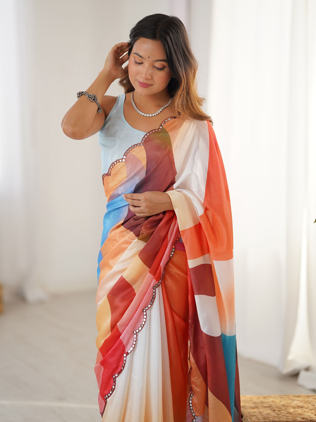 Multicolor color Saree in Chinon Silk fabric with Digital Print, Lace, Mirror work