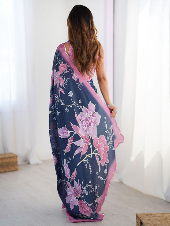Chinon Silk Party Wear Saree in Blue with Digital Print work