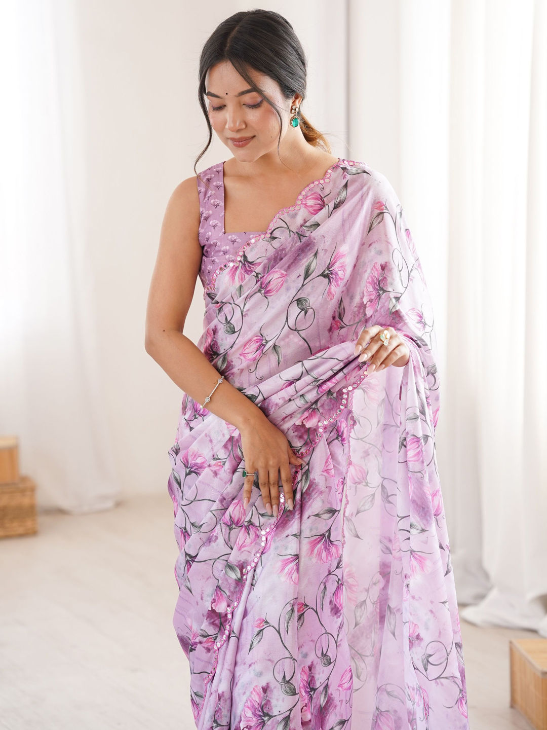 Purple and Violet color Saree in Chinon Silk fabric with Digital Print, Floral, Mirror work