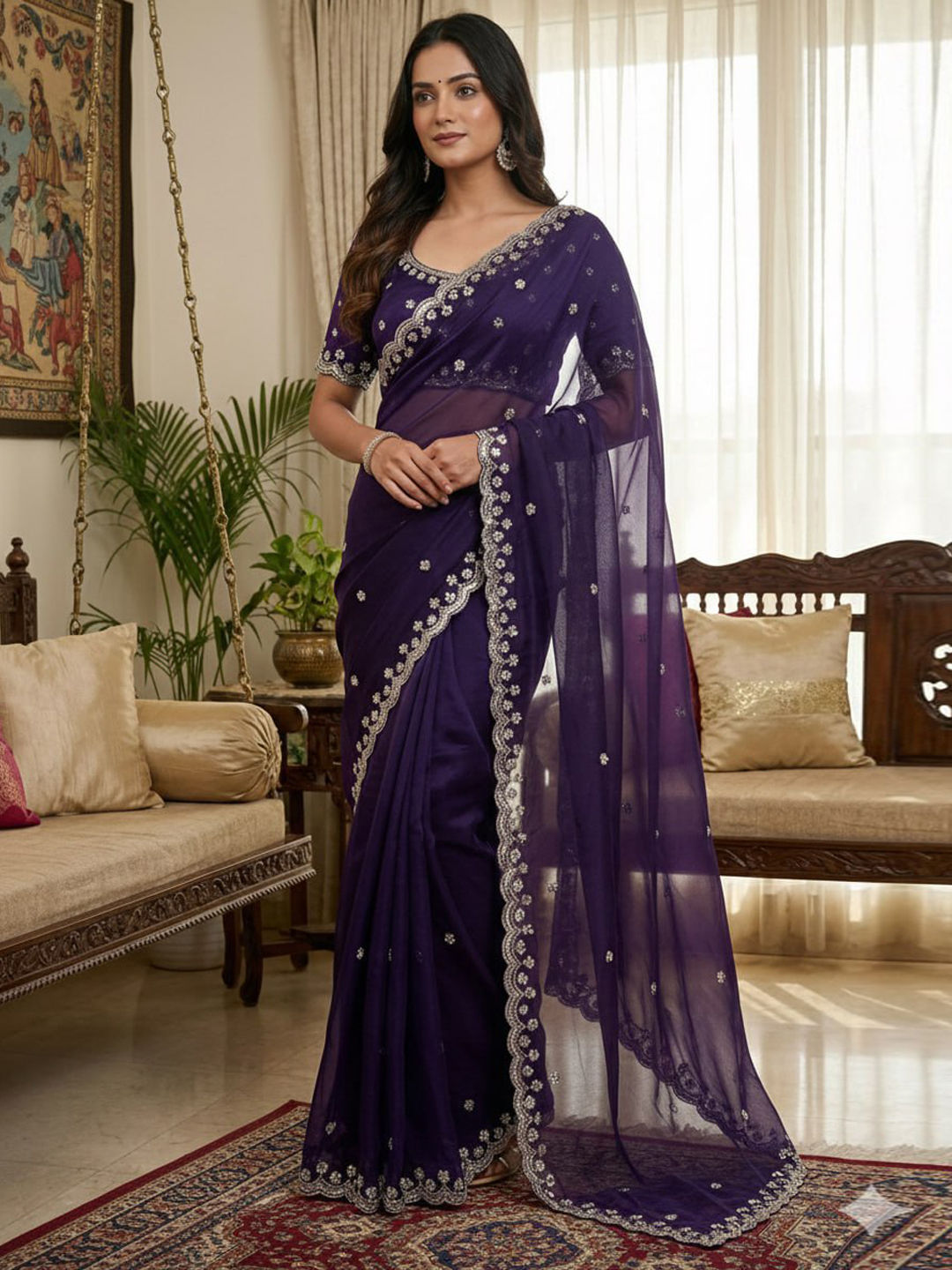 Purple and Violet color Saree in Chinon Silk fabric with Border, Embroidered, Mirror, Sequence work