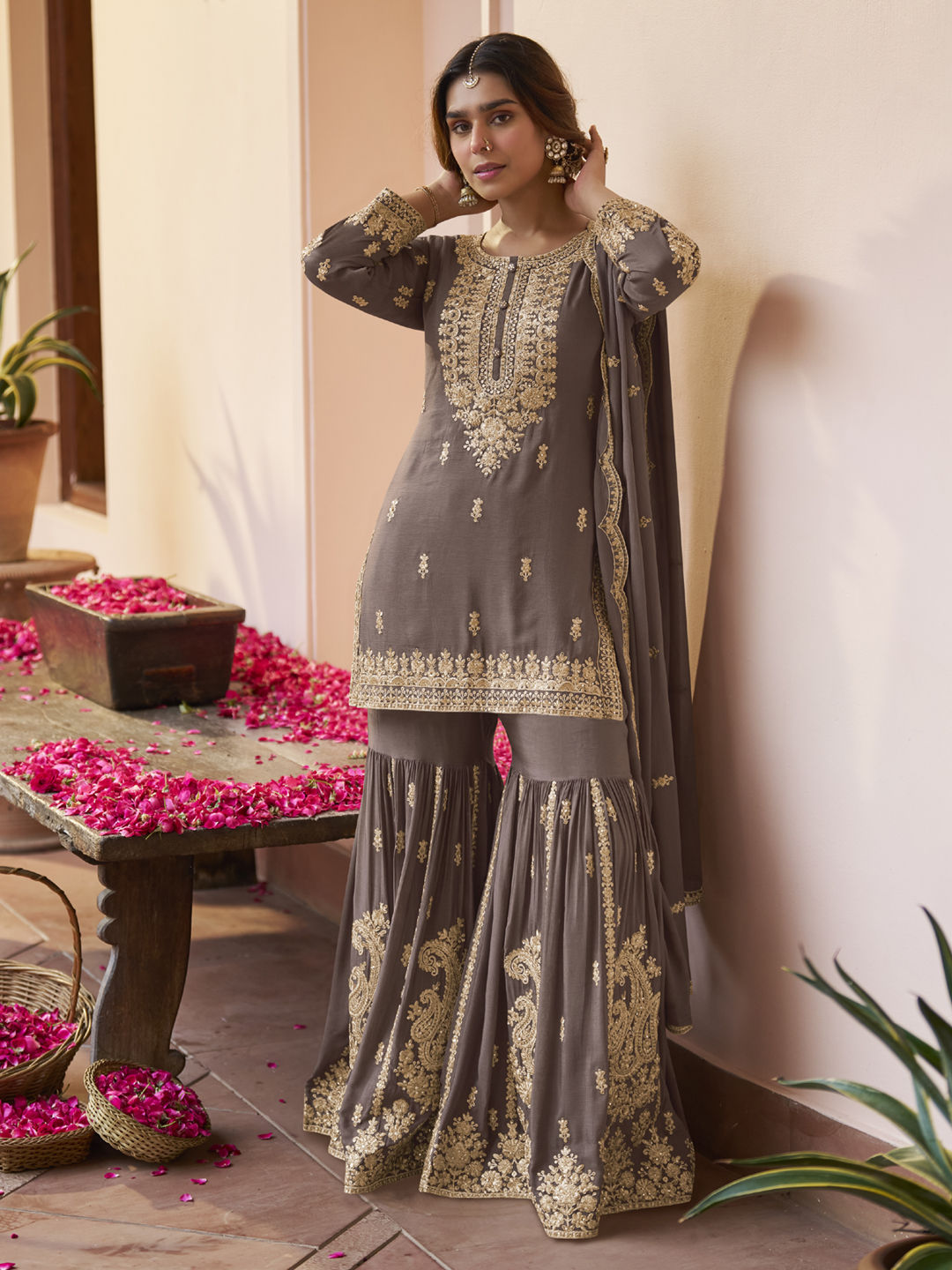in Beige and Brown with Zari work