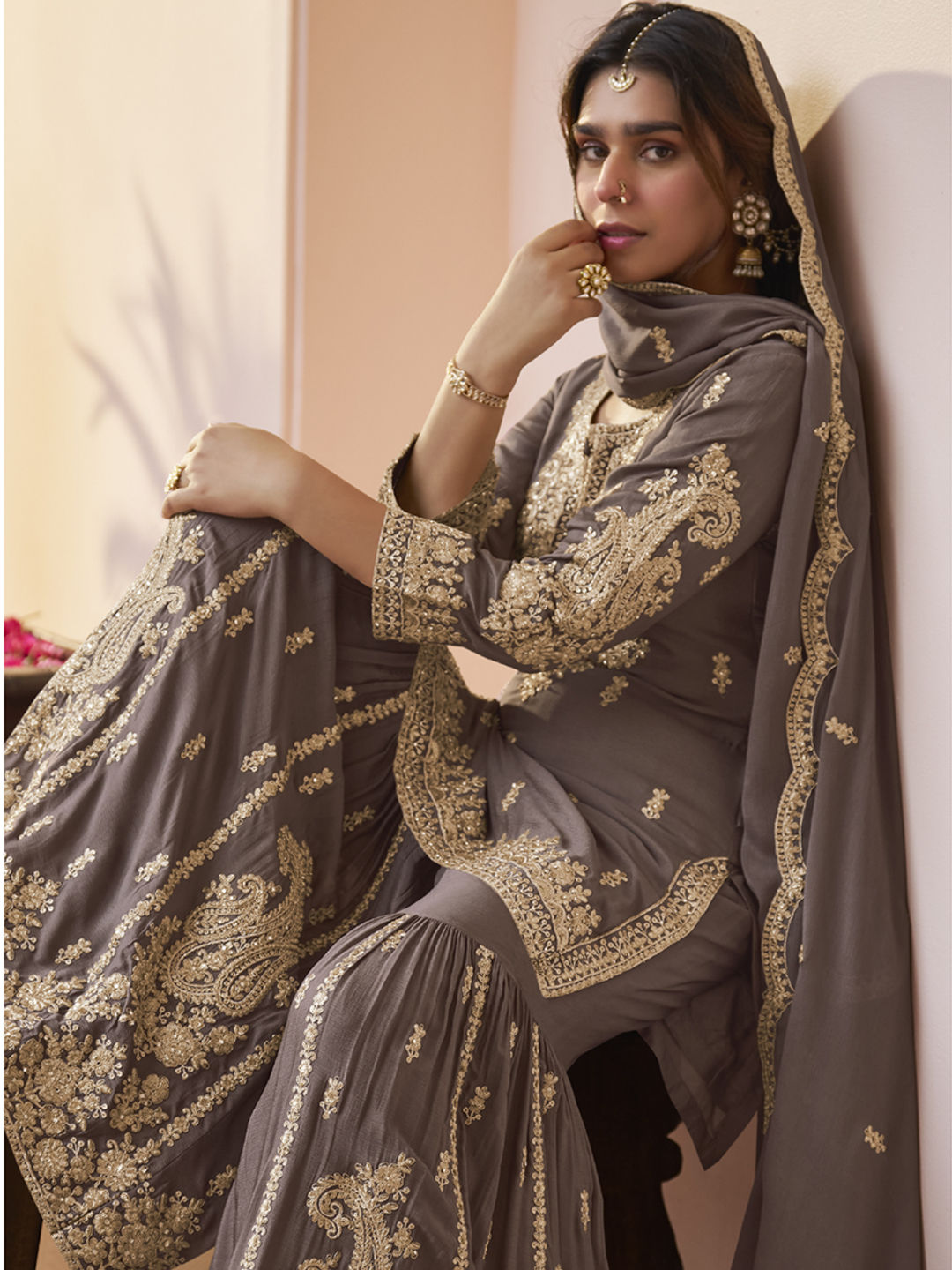 Beige and Brown color Salwar Kameez in Chinon Silk fabric with Embroidered, Sequence, Thread, Zari work