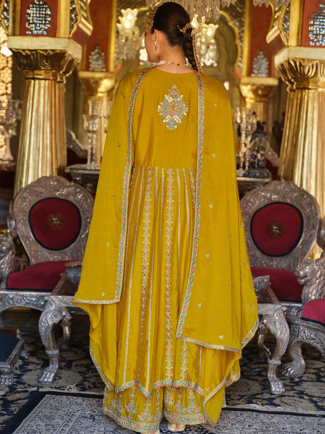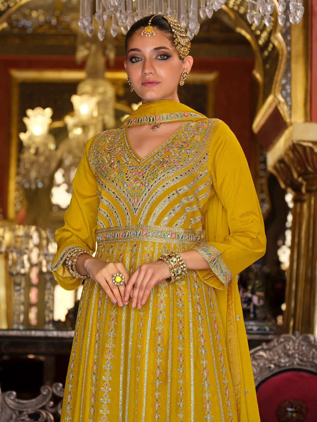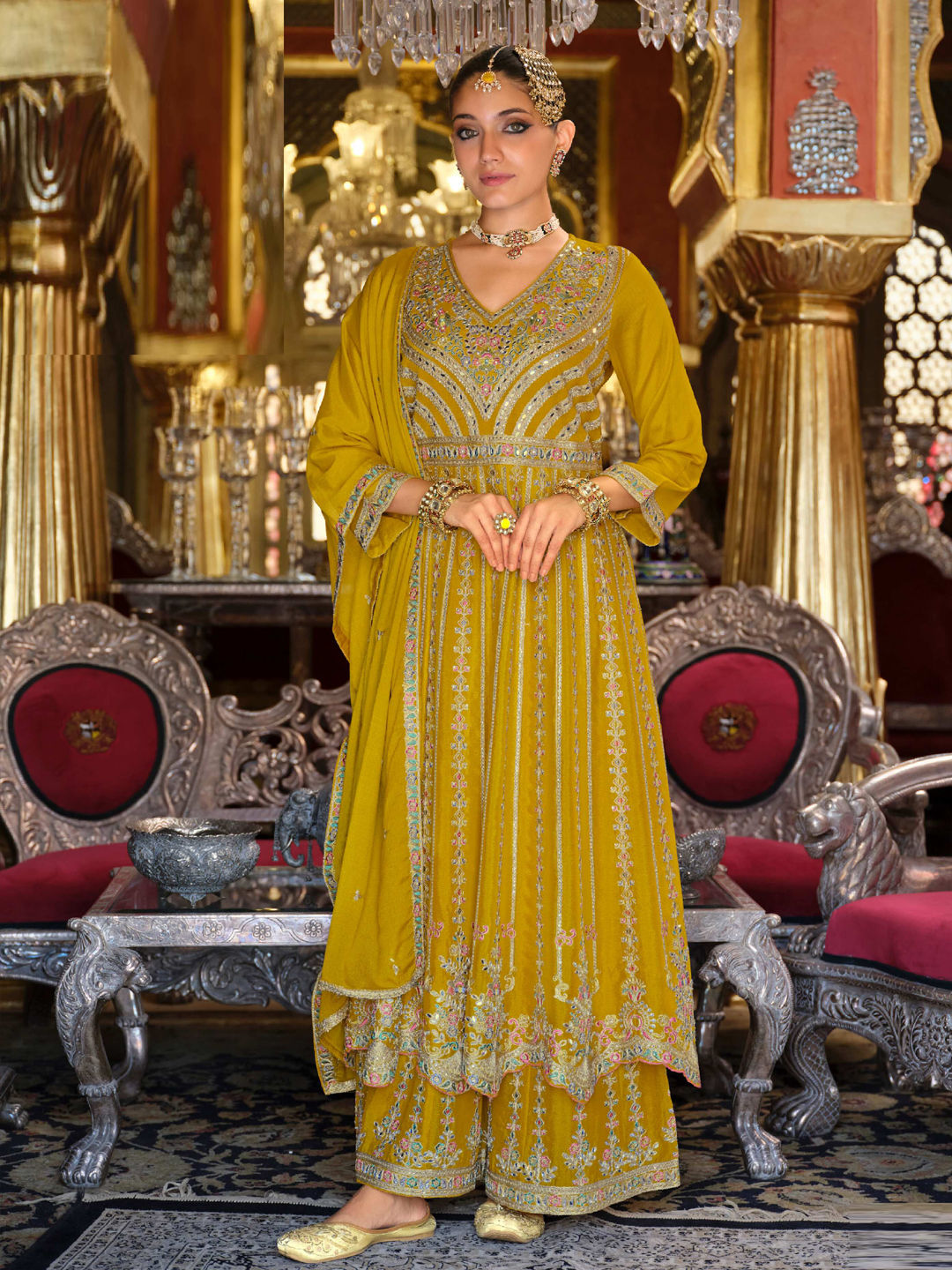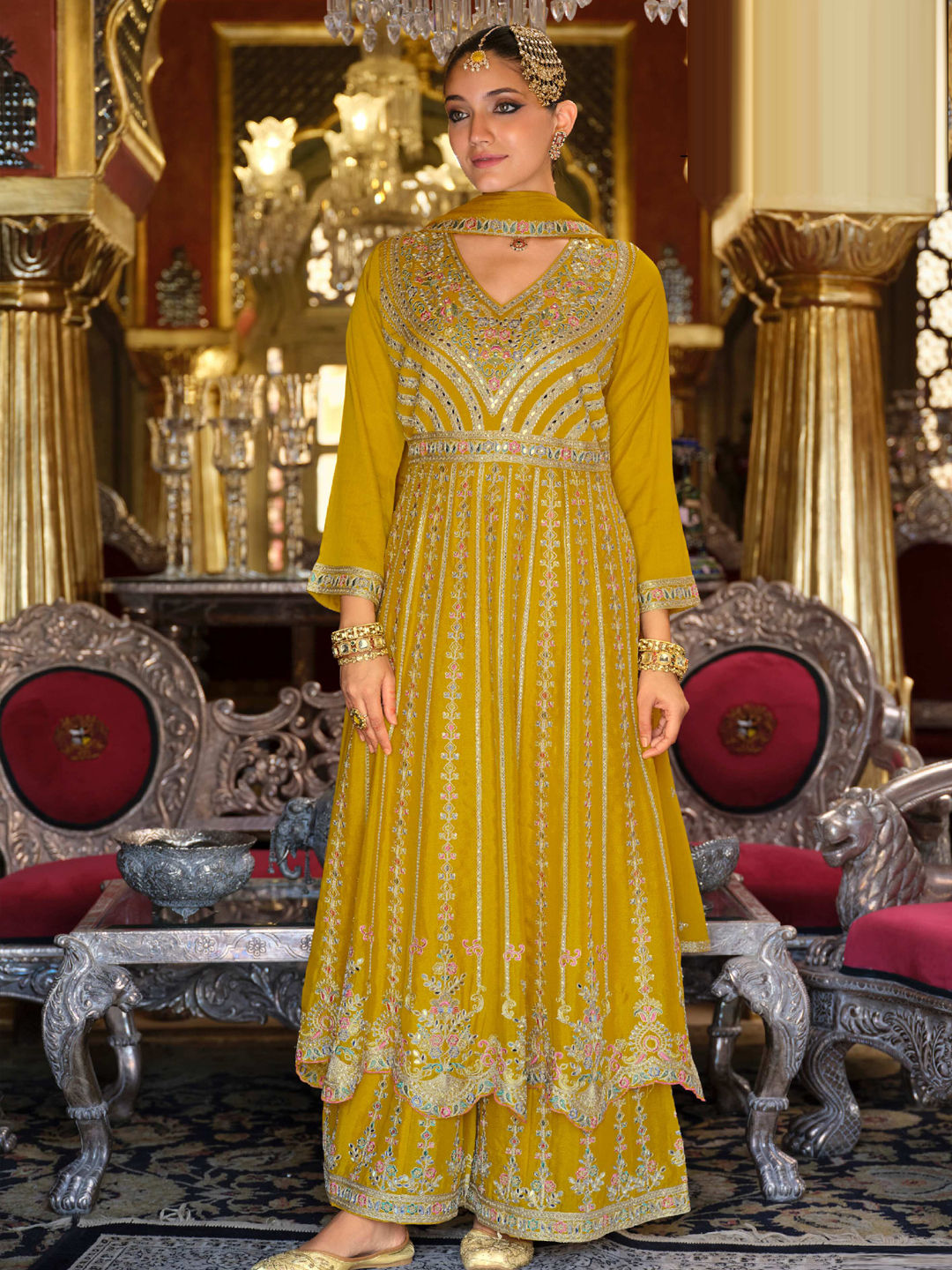 Gold color Salwar Kameez in Chinon Silk fabric with Embroidered, Mirror, Thread work