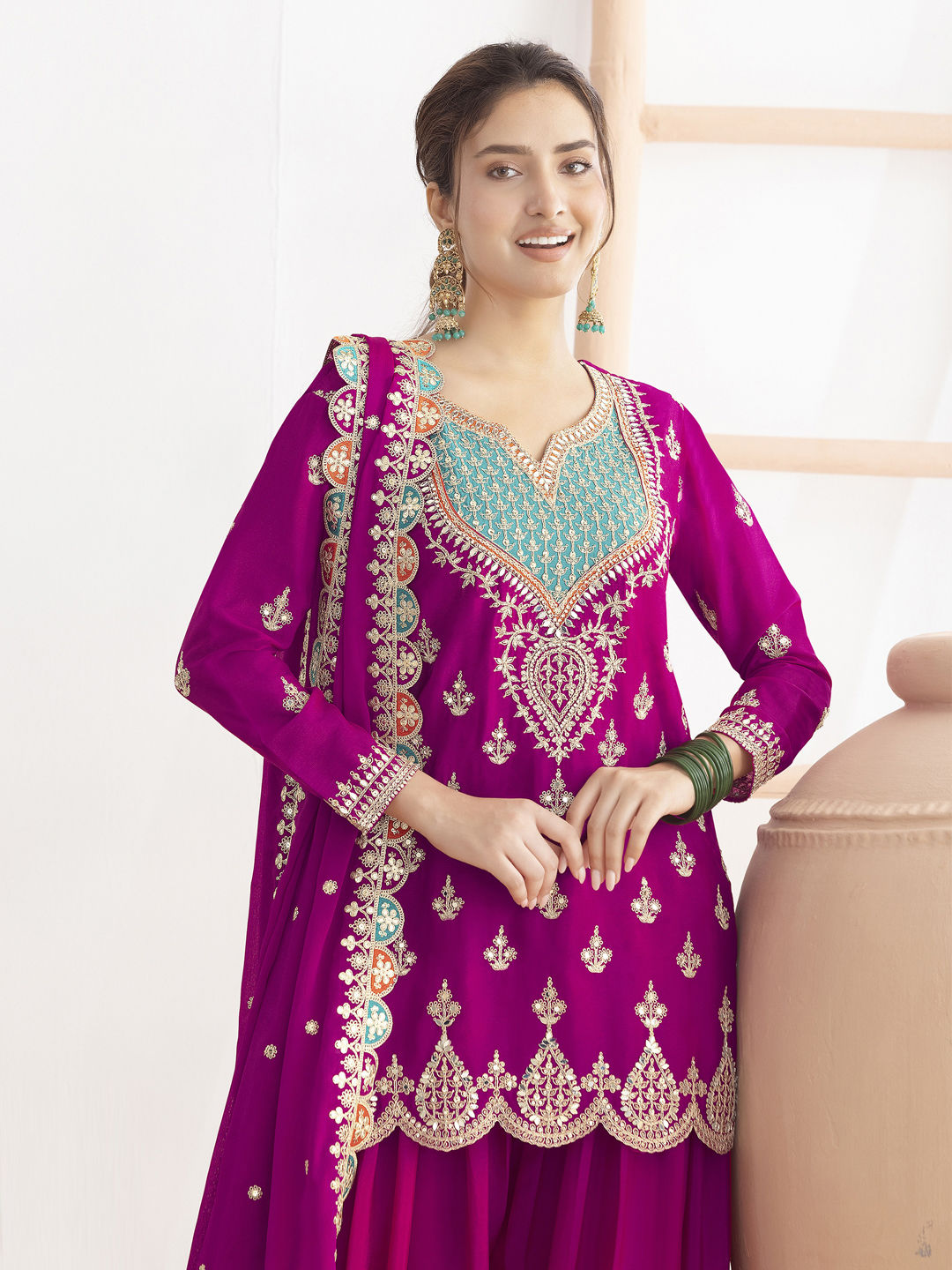Pink and Majenta color Salwar Kameez in Chinon Silk fabric with Embroidered, Mirror, Sequence work