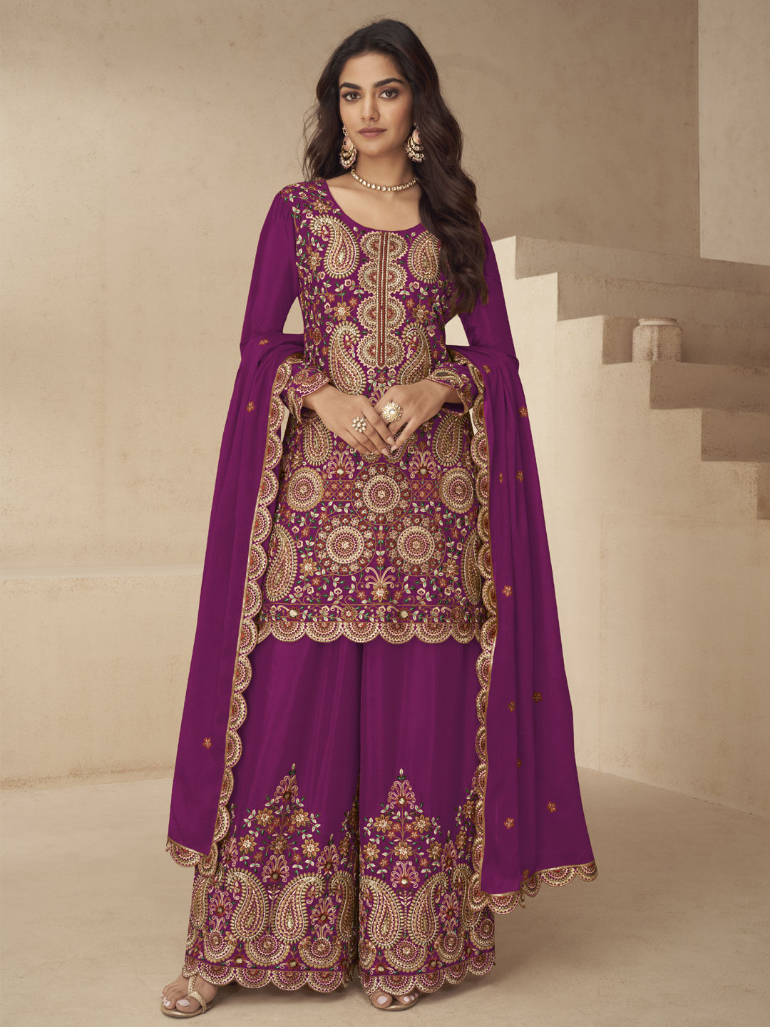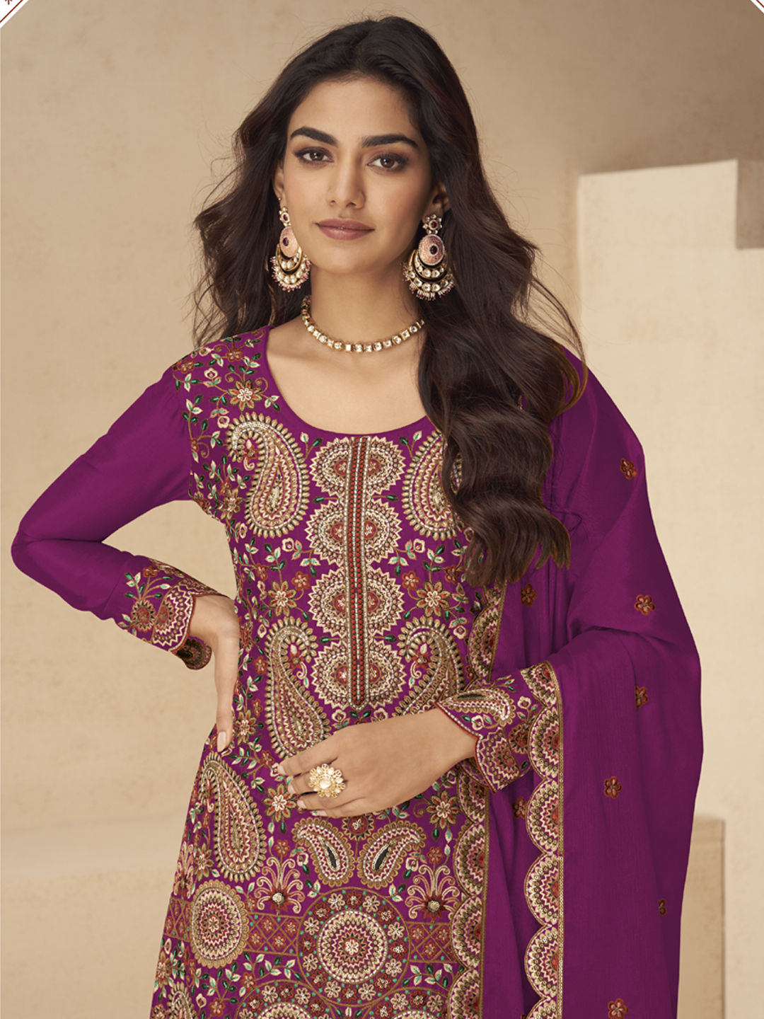 Chinon Silk Wedding Salwar Kameez in Purple and Violet with Thread work