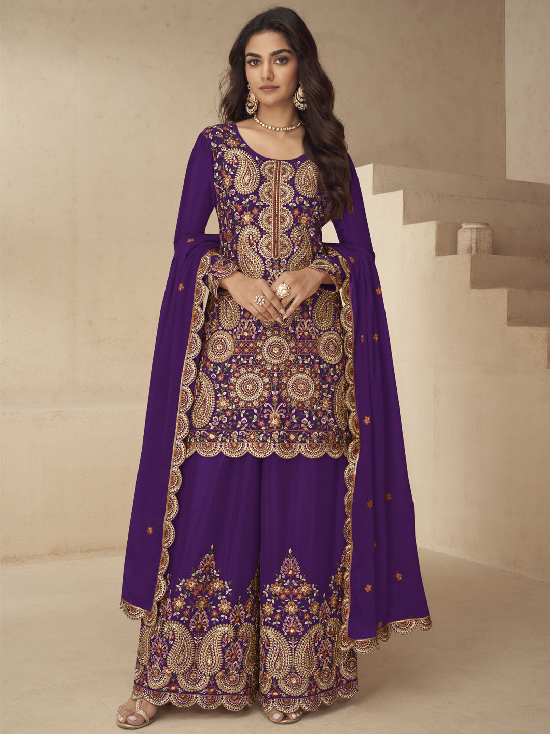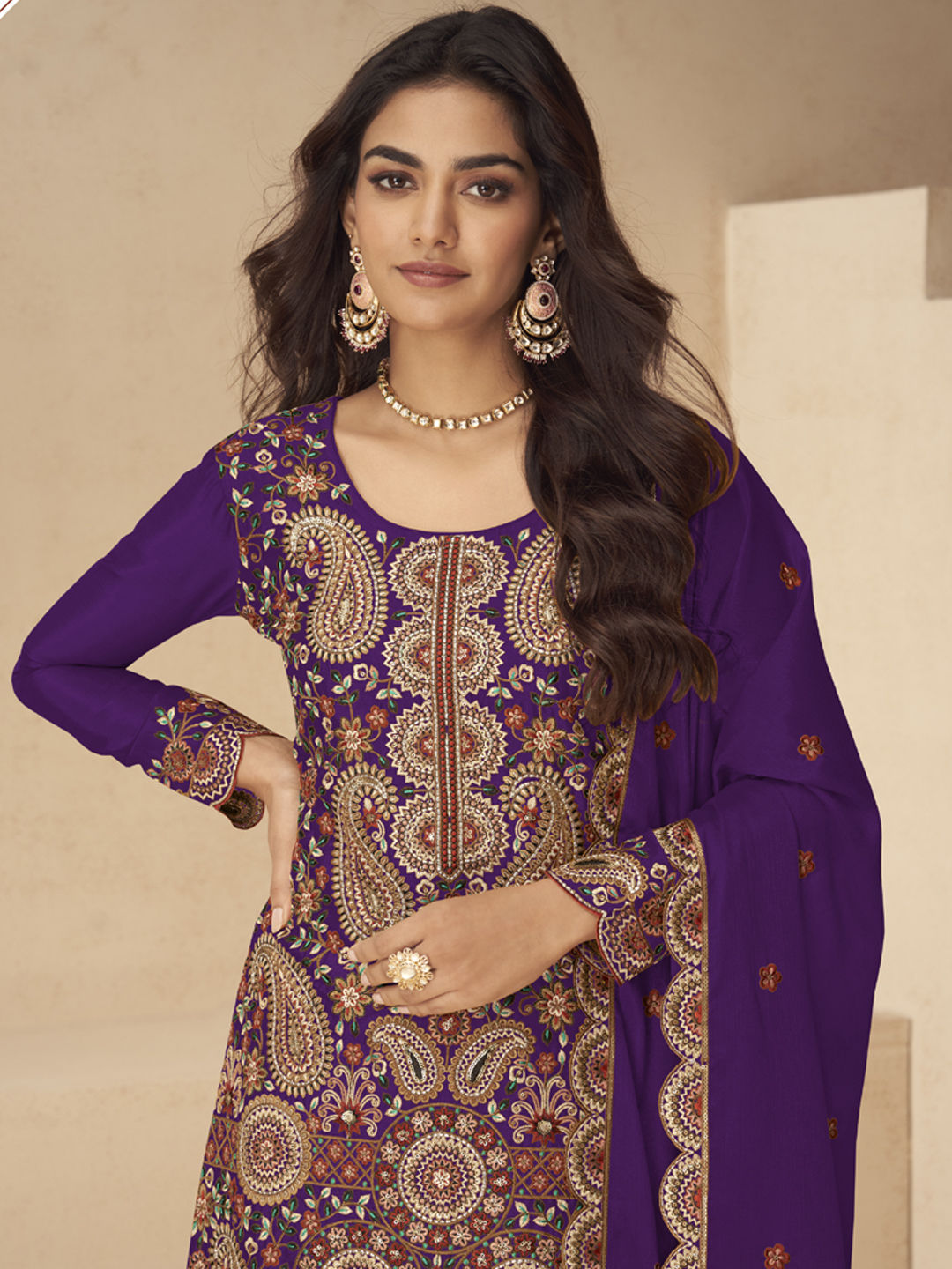 Purple and Violet color Salwar Kameez in Chinon Silk fabric with Embroidered, Sequence, Thread work