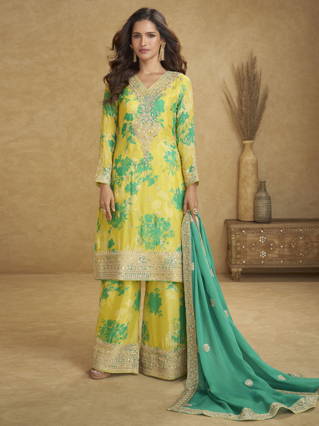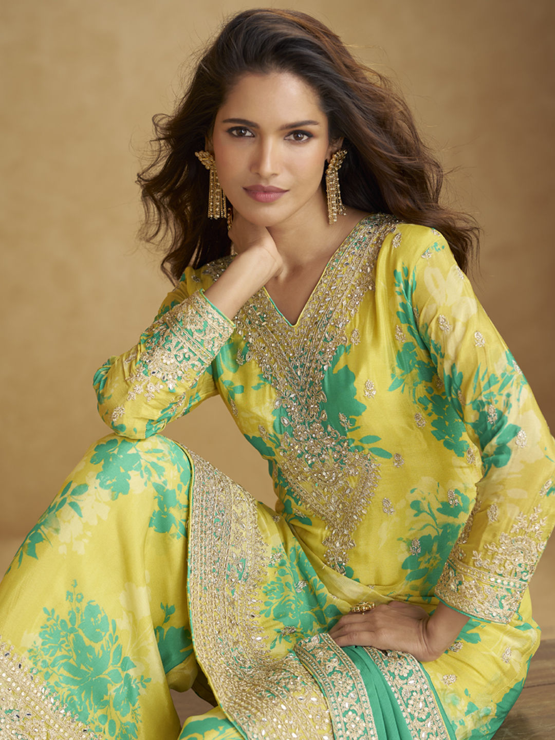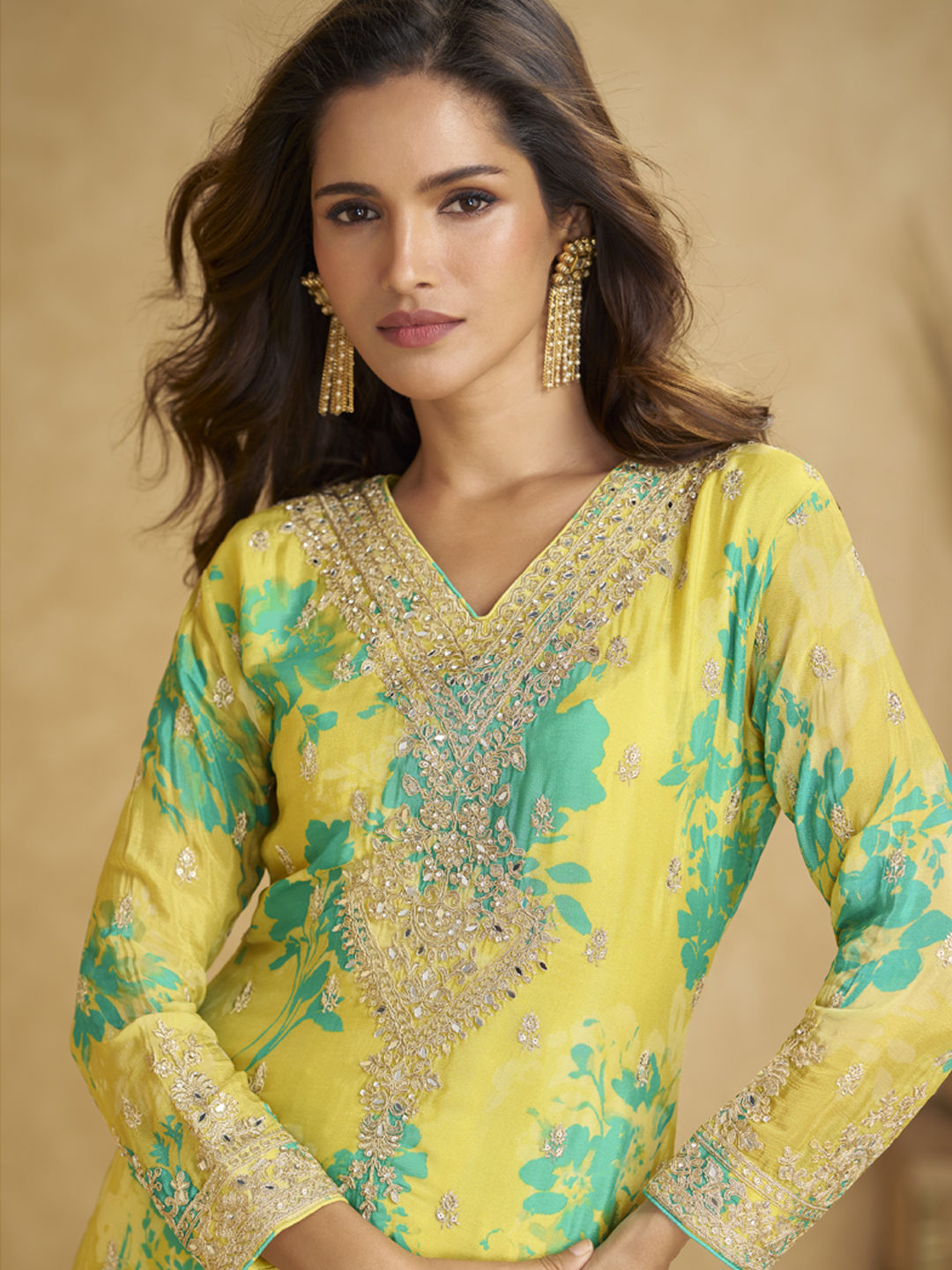 Green, Yellow color Salwar Kameez in Chinon Silk fabric with Embroidered, Mirror, Stone, Thread, Zari work