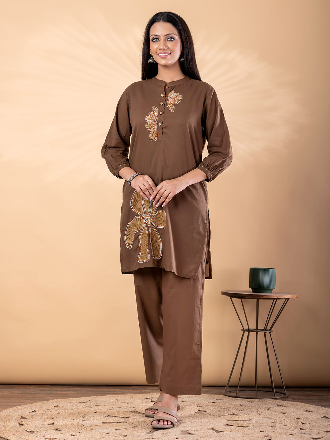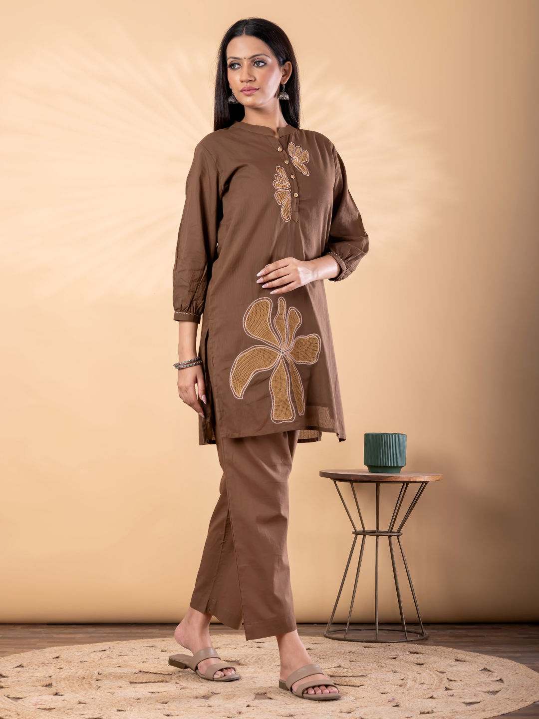 Cotton Casual Co-ords Set in Beige and Brown with Embroidered work