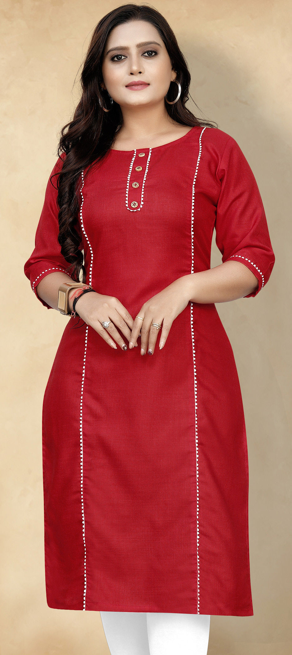 Cotton Casual Kurti in Red and Maroon with Lace work