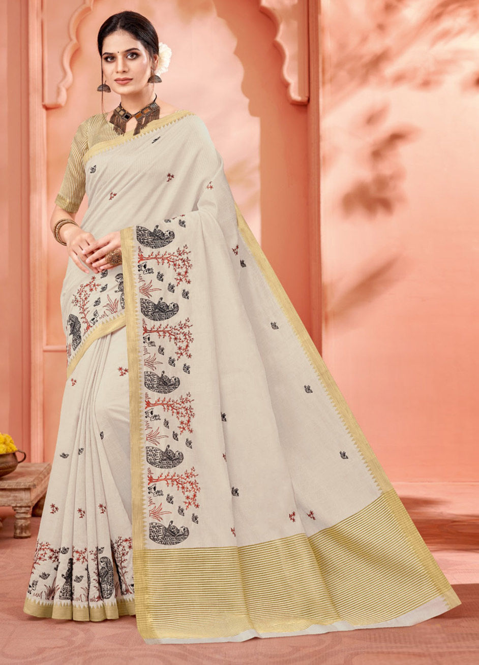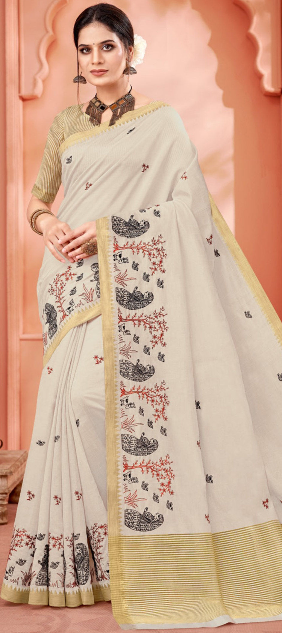 White and Off White color Saree in Cotton fabric with Embroidered, Resham, Thread work