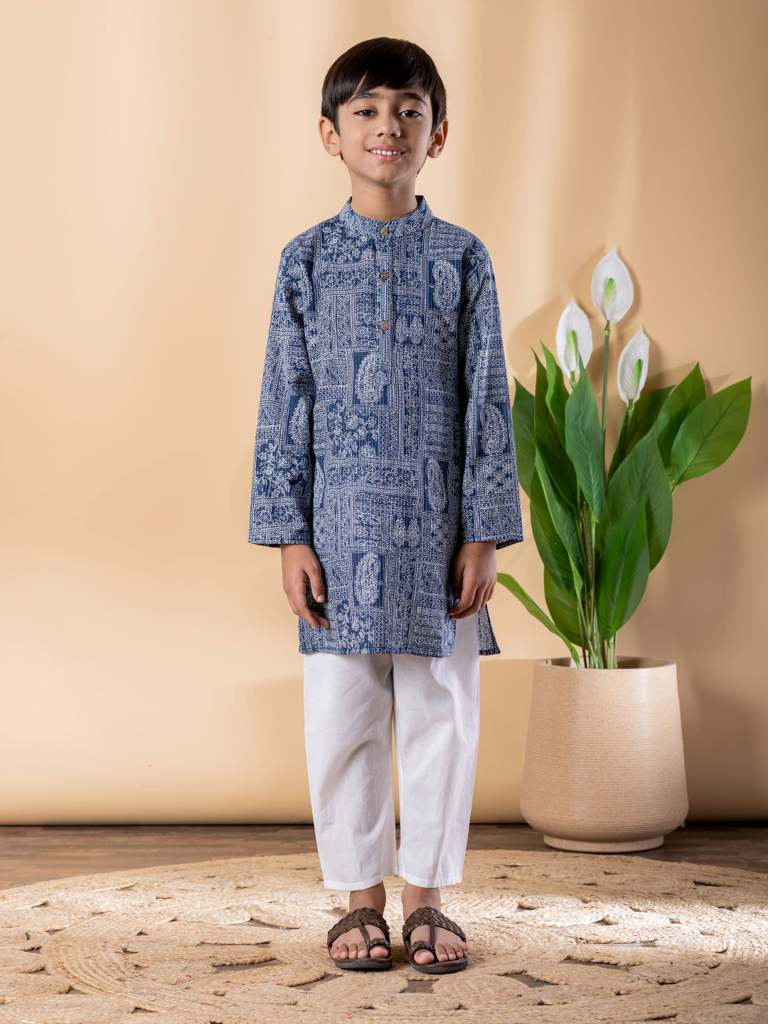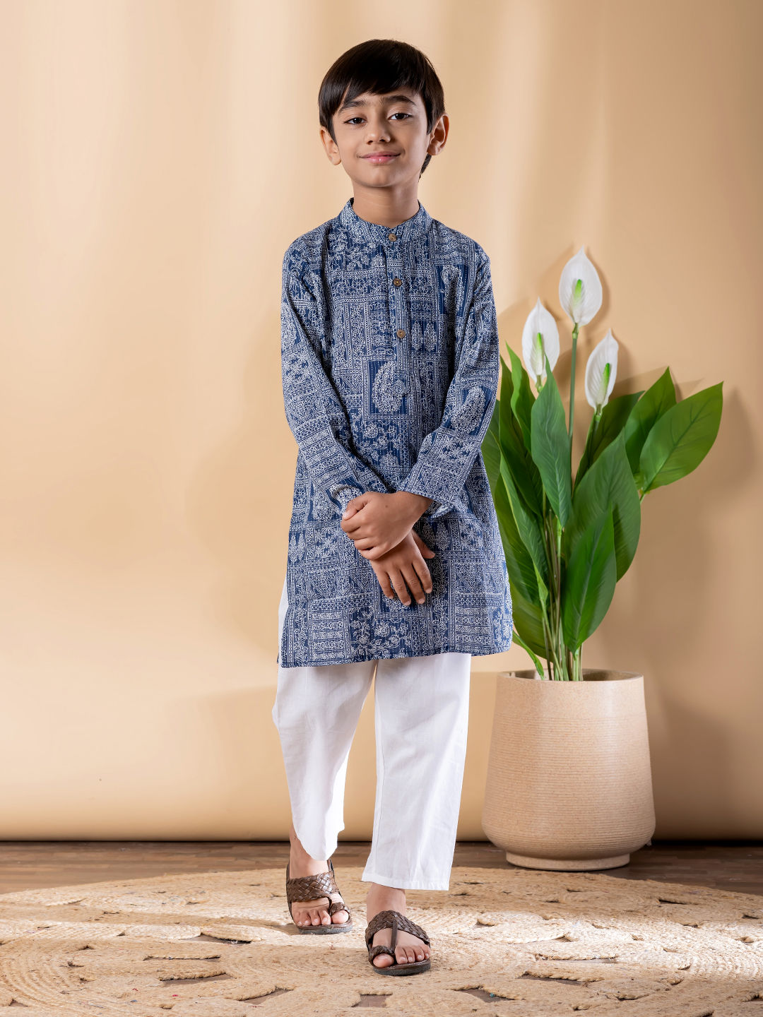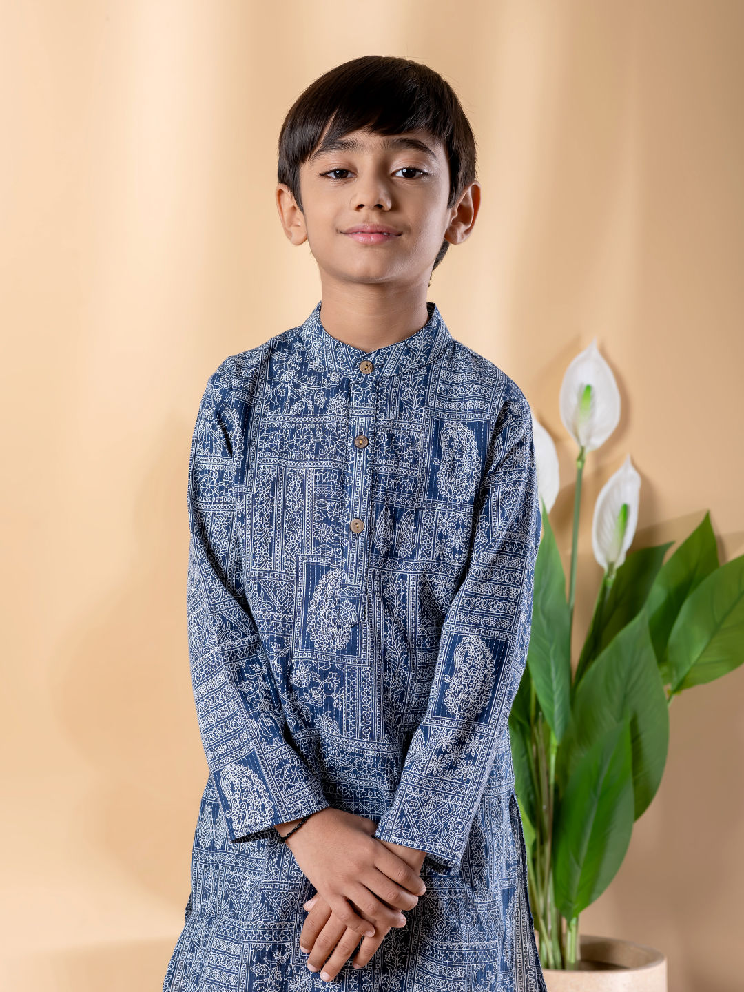 Blue color Boys Kurta Pyjama in Cotton fabric with Printed work