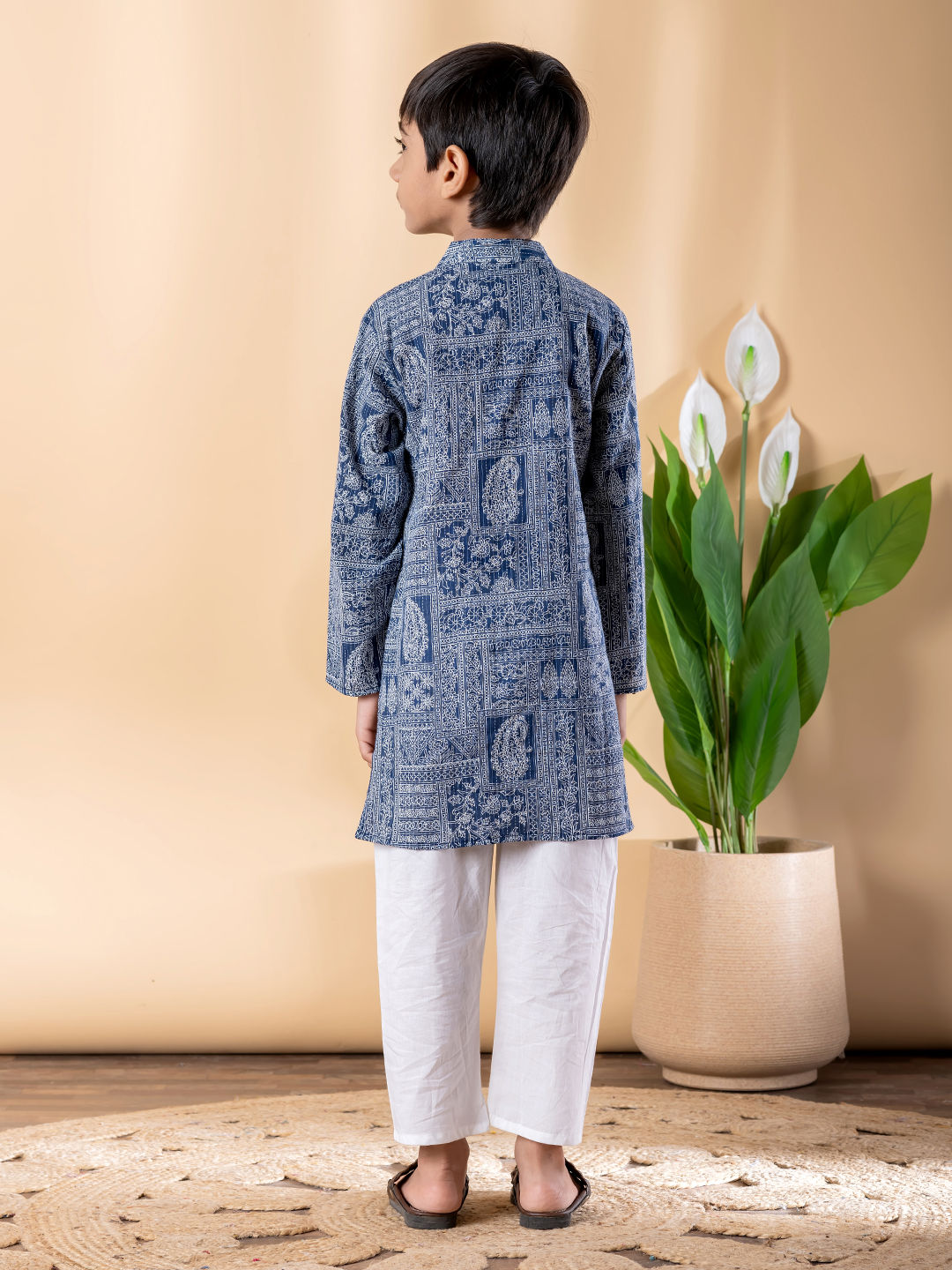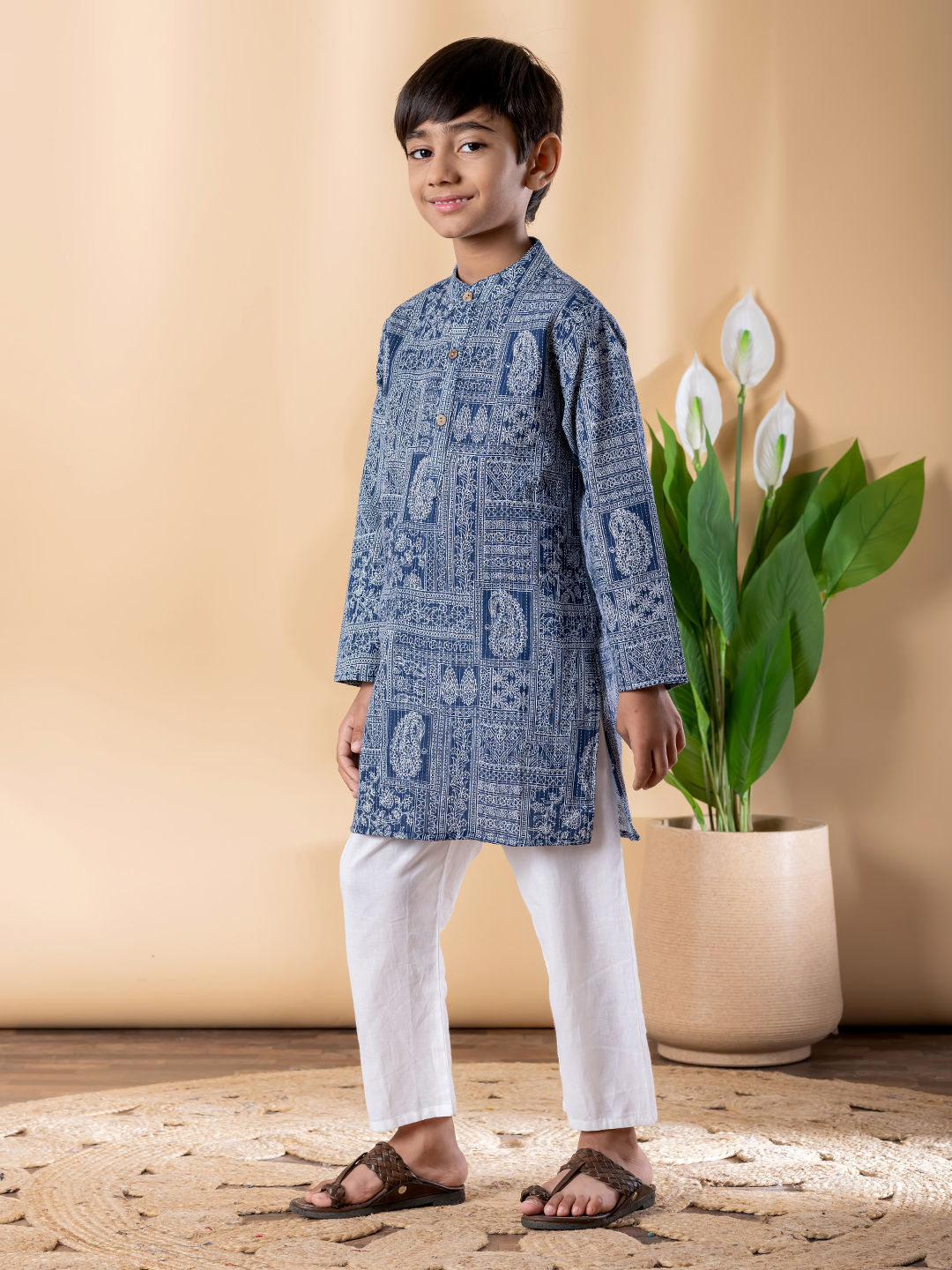 Cotton Festive Boys Kurta Pyjama in Blue with Printed work