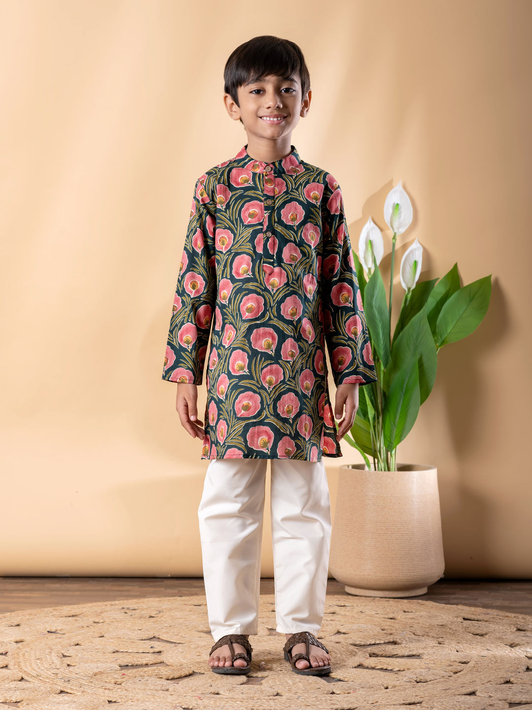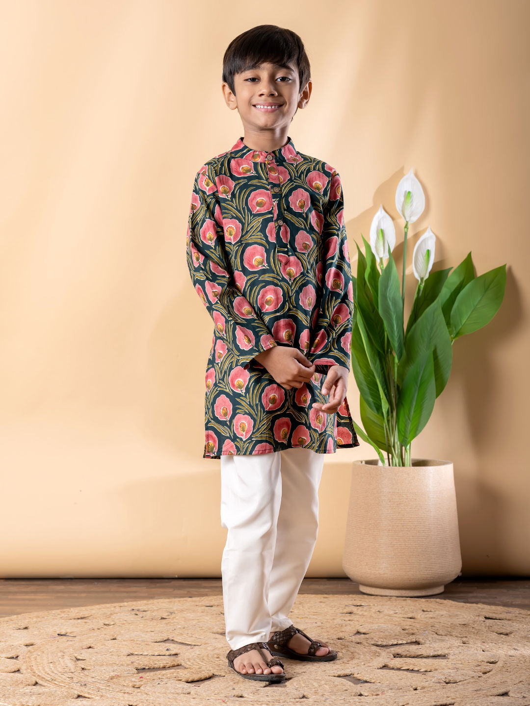 Cotton Festive Boys Kurta Pyjama in Green with Printed work
