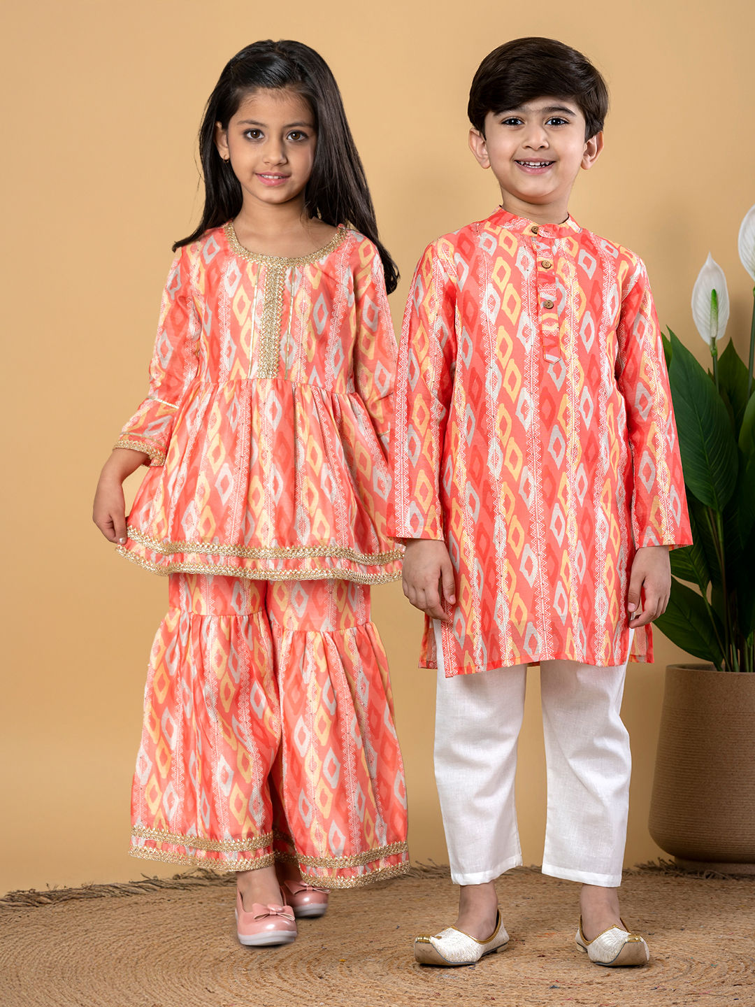 Cotton Festive Boys Kurta Pyjama in Orange with Floral work